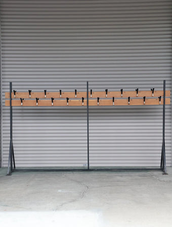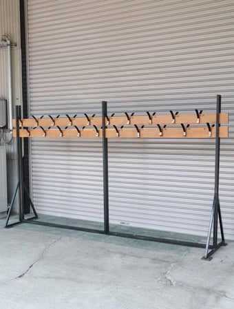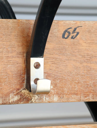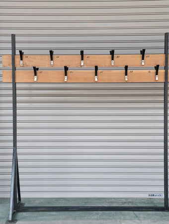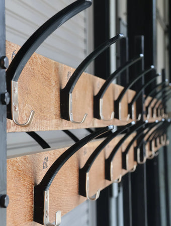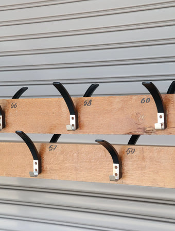 インダストリアルなウッドとアイアンの組み合わせで、各フックには手書きのナンバリングが入ります。