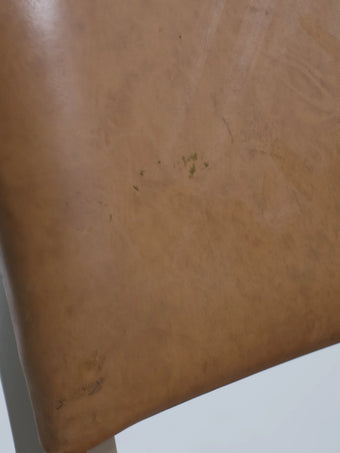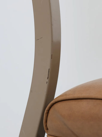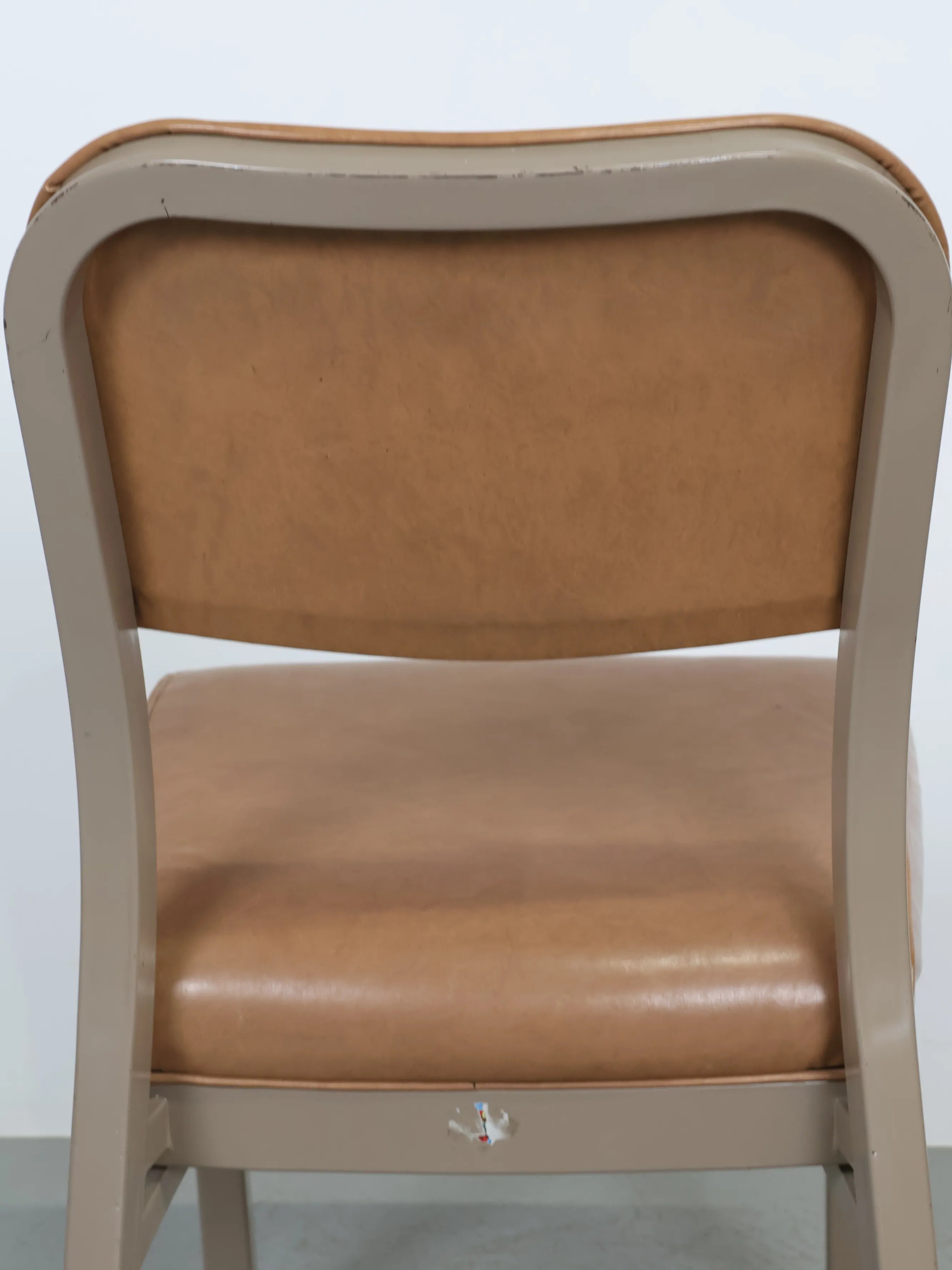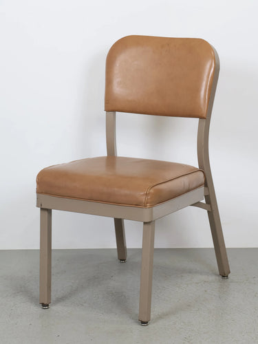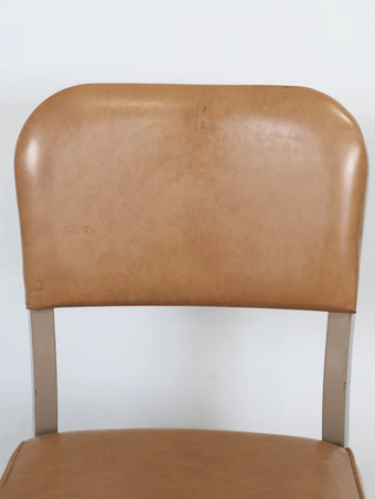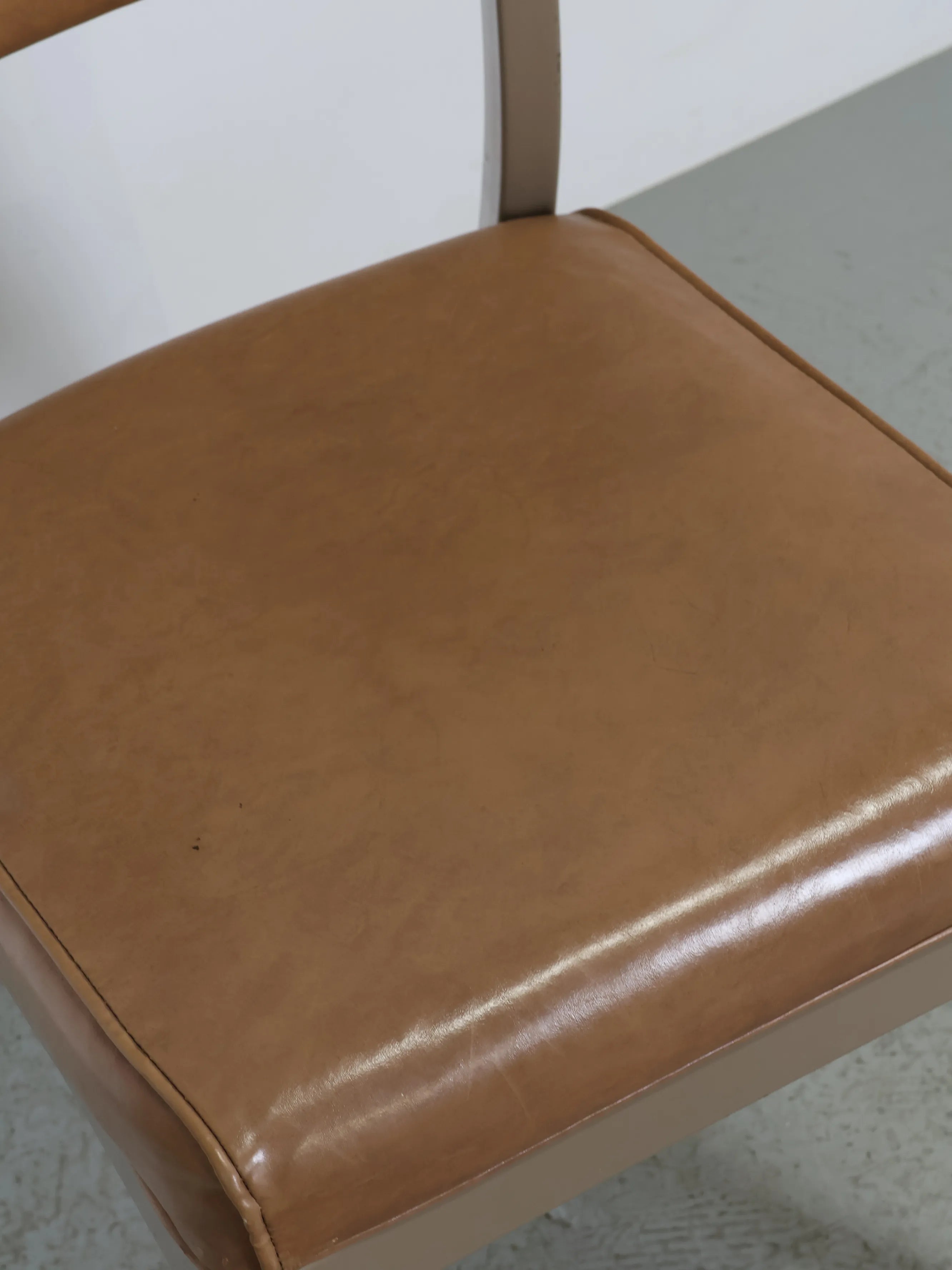 座面と背もたれには、経年変化が美しいキャメルカラーのビニールレザーを使用。