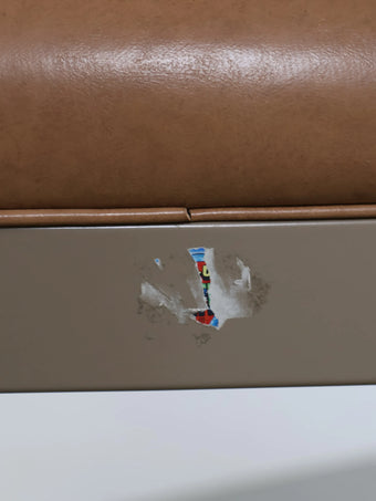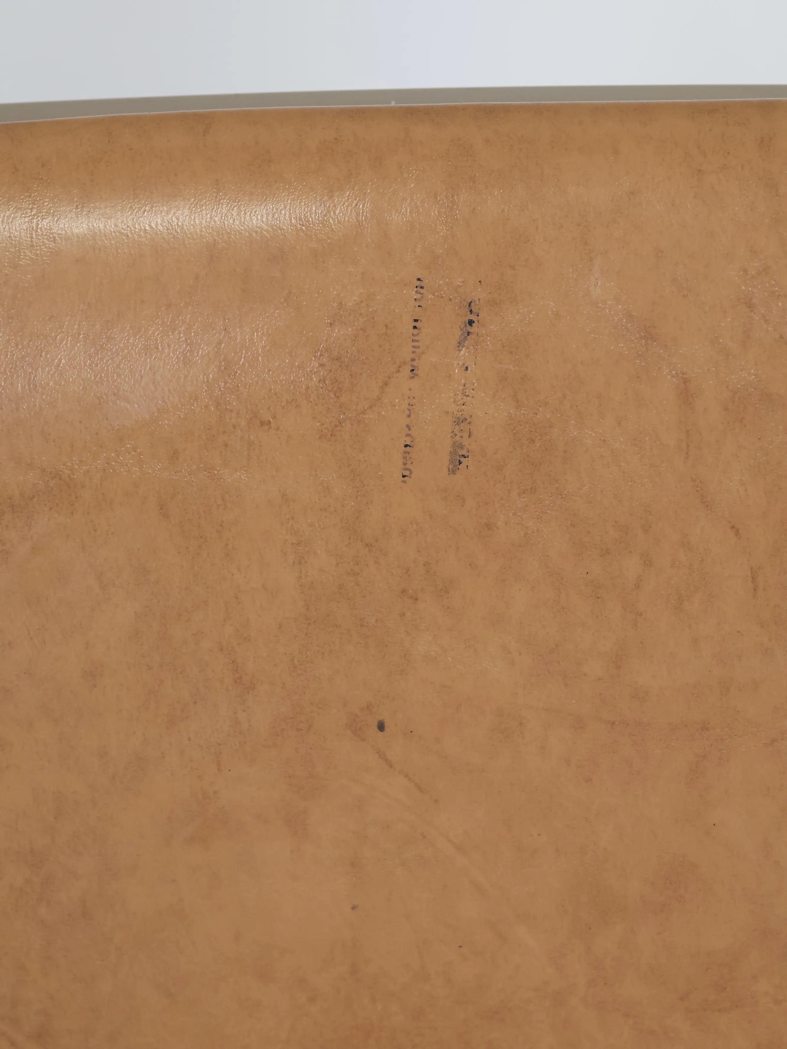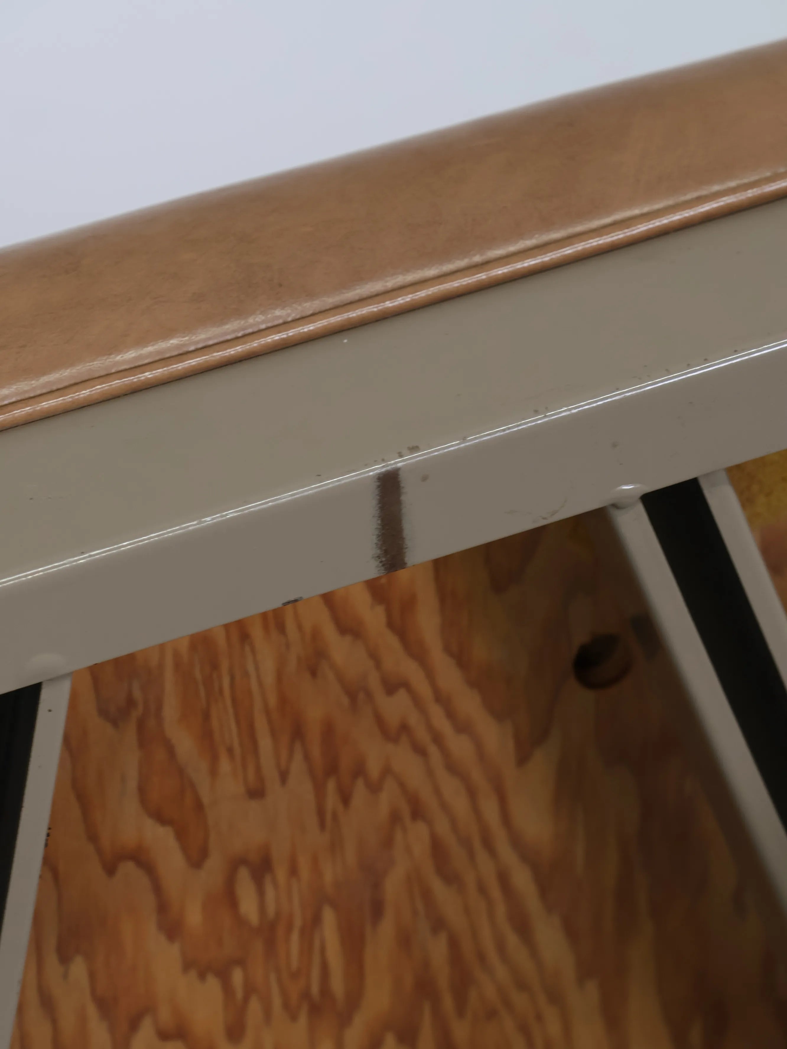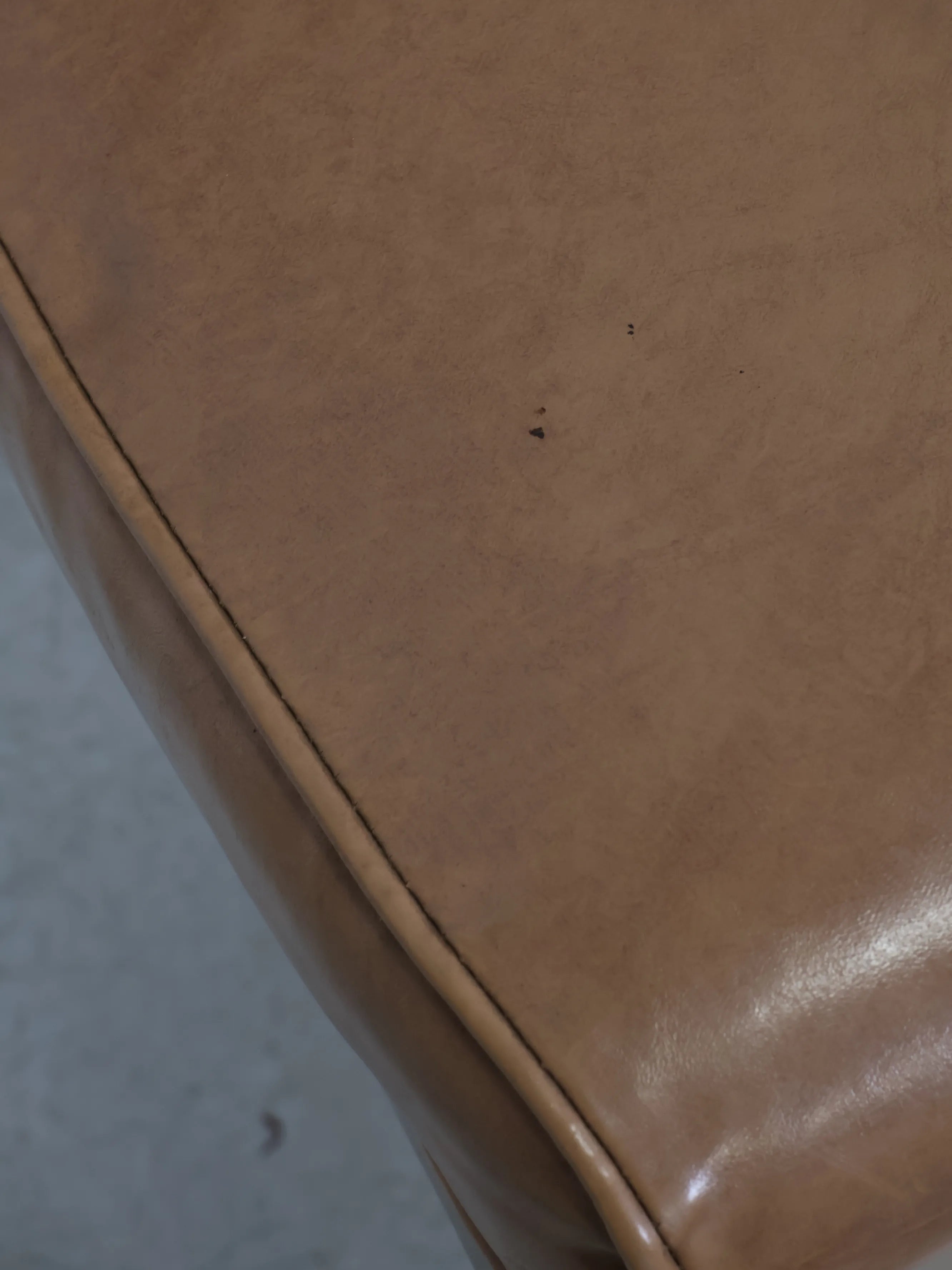 座面と背もたれには、経年変化が美しいキャメルカラーのビニールレザーを使用。