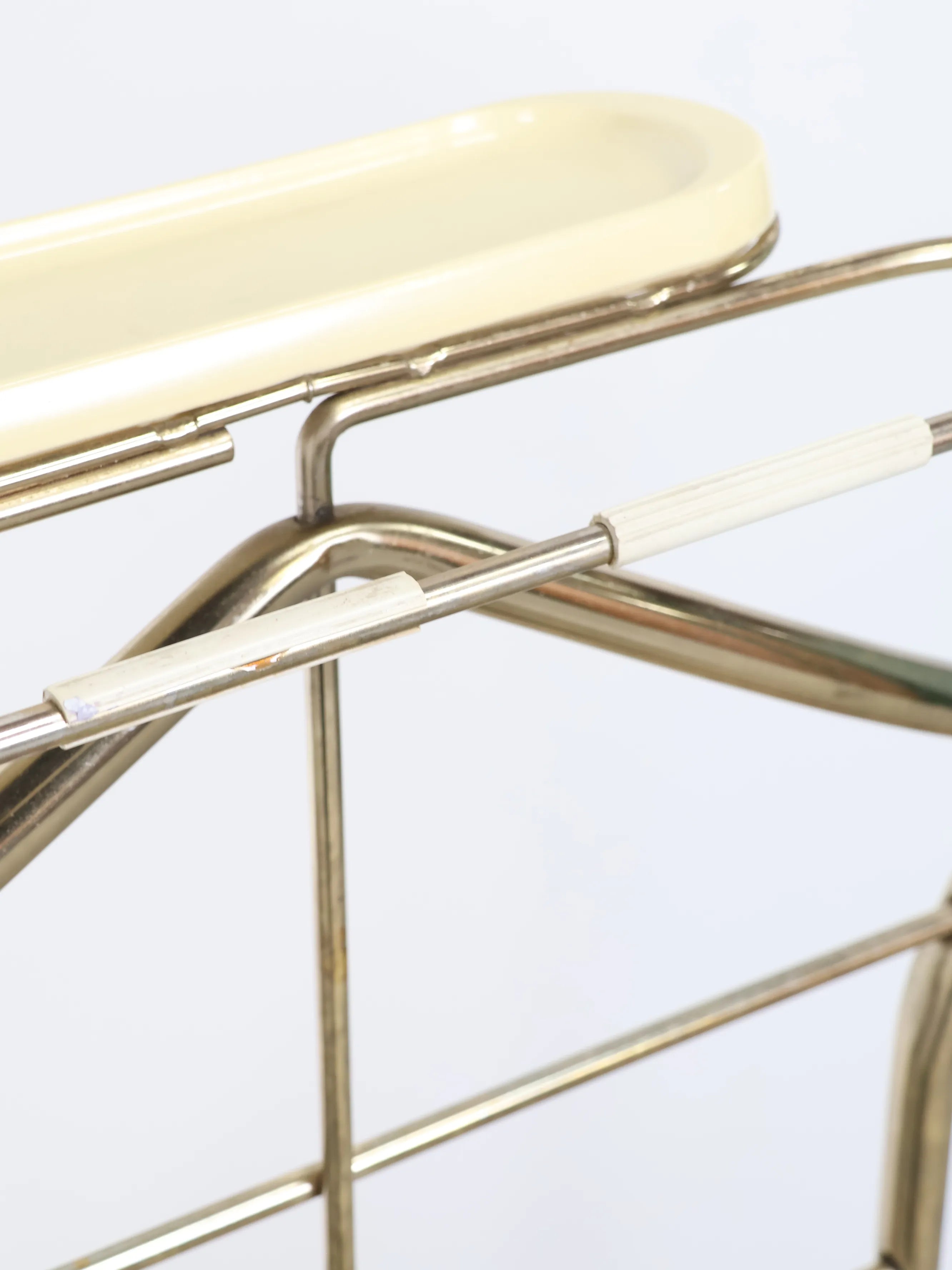 こちらはホワイトのビニールレザーにゴールドのフレームがエレガントなデザインとなっております。