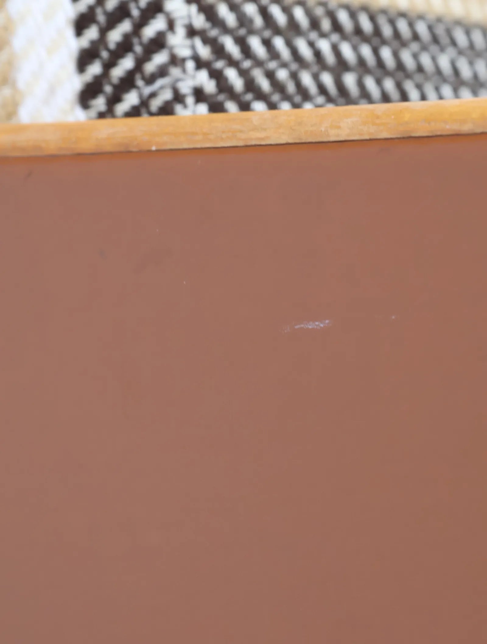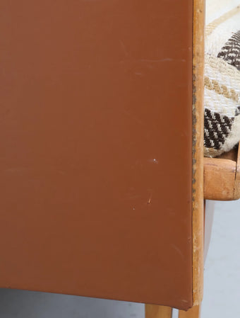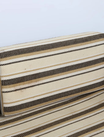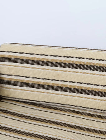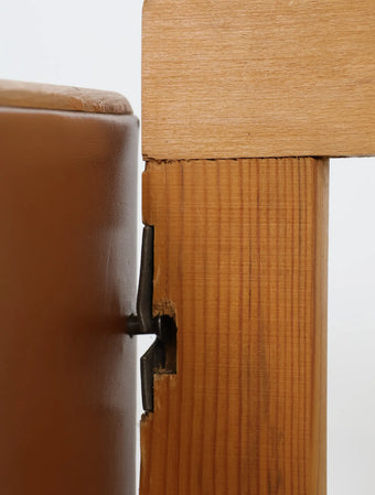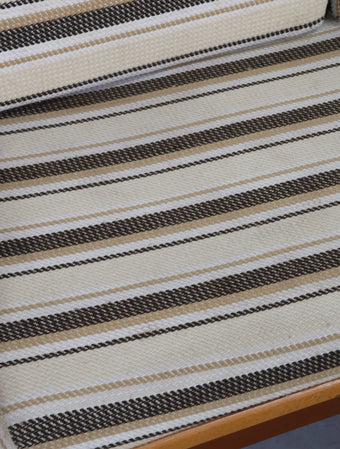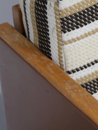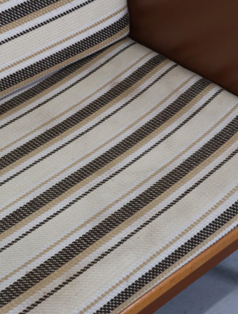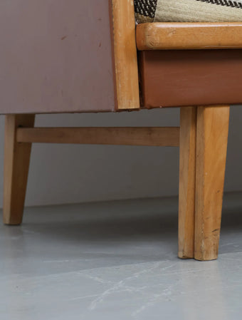 ウッドとビニールレザーの組み合わせに加え、ボーダー柄のクッションが落ち着いた配色になっておりレトロで温かみのある雰囲気を演出しています。