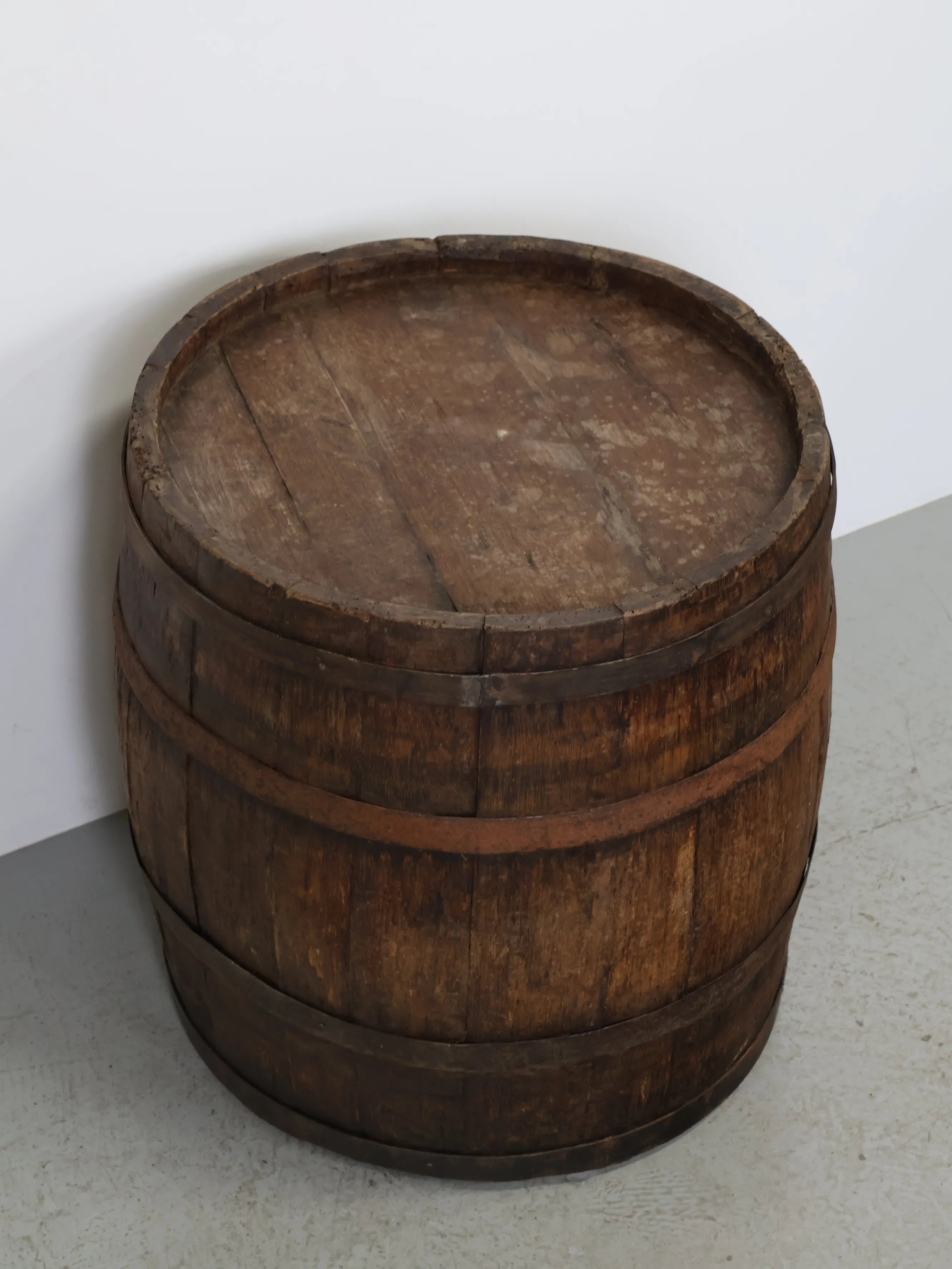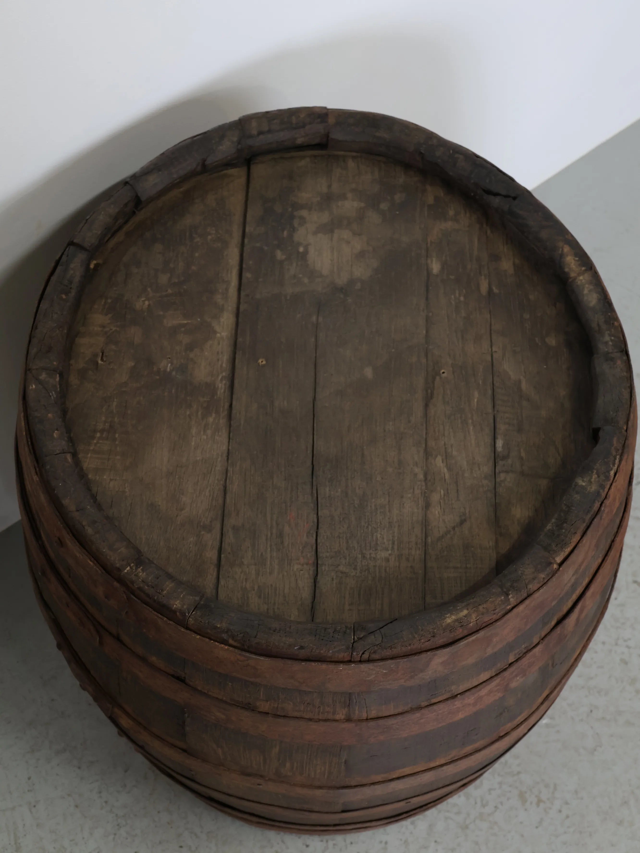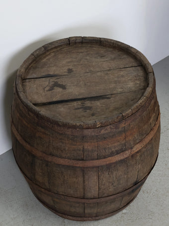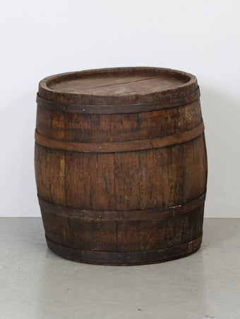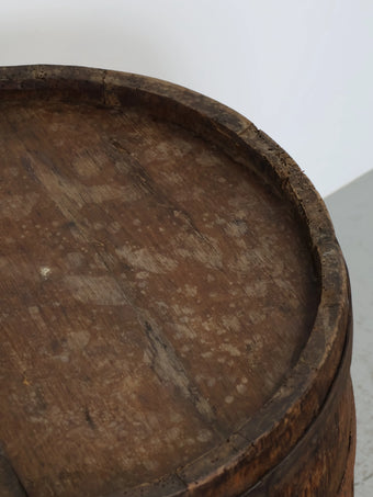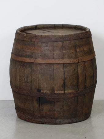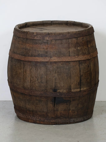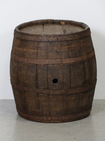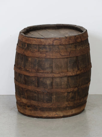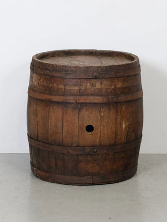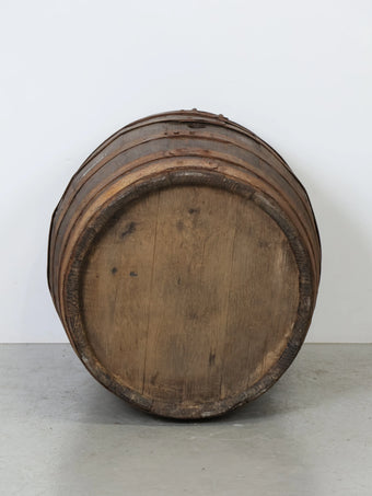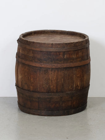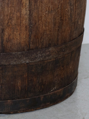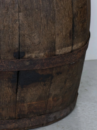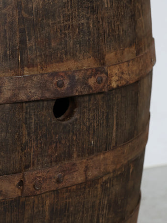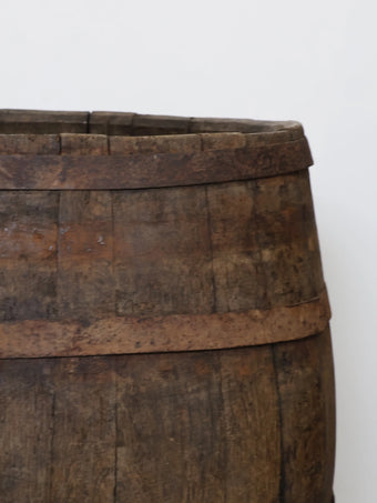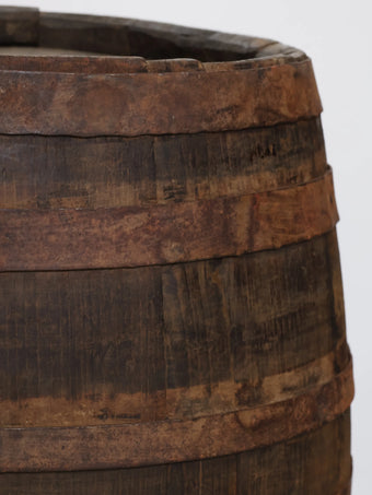 厚みのある木板を組み合わせ、鉄製のフープでしっかりと固定された伝統的な樽の構造が特徴。