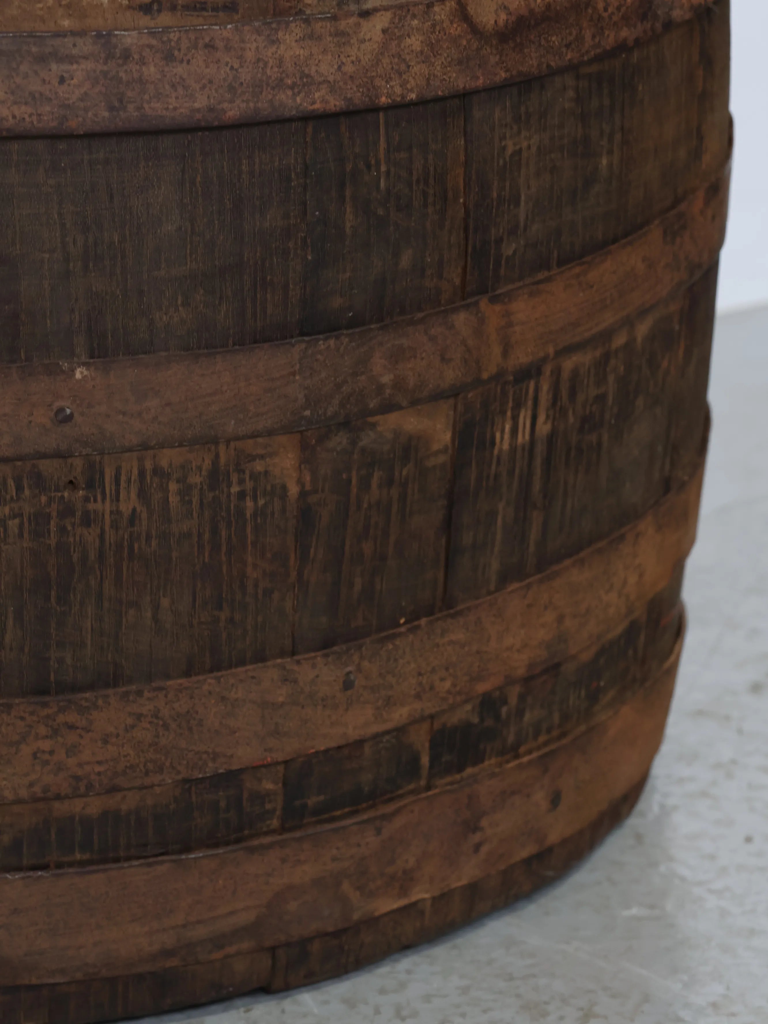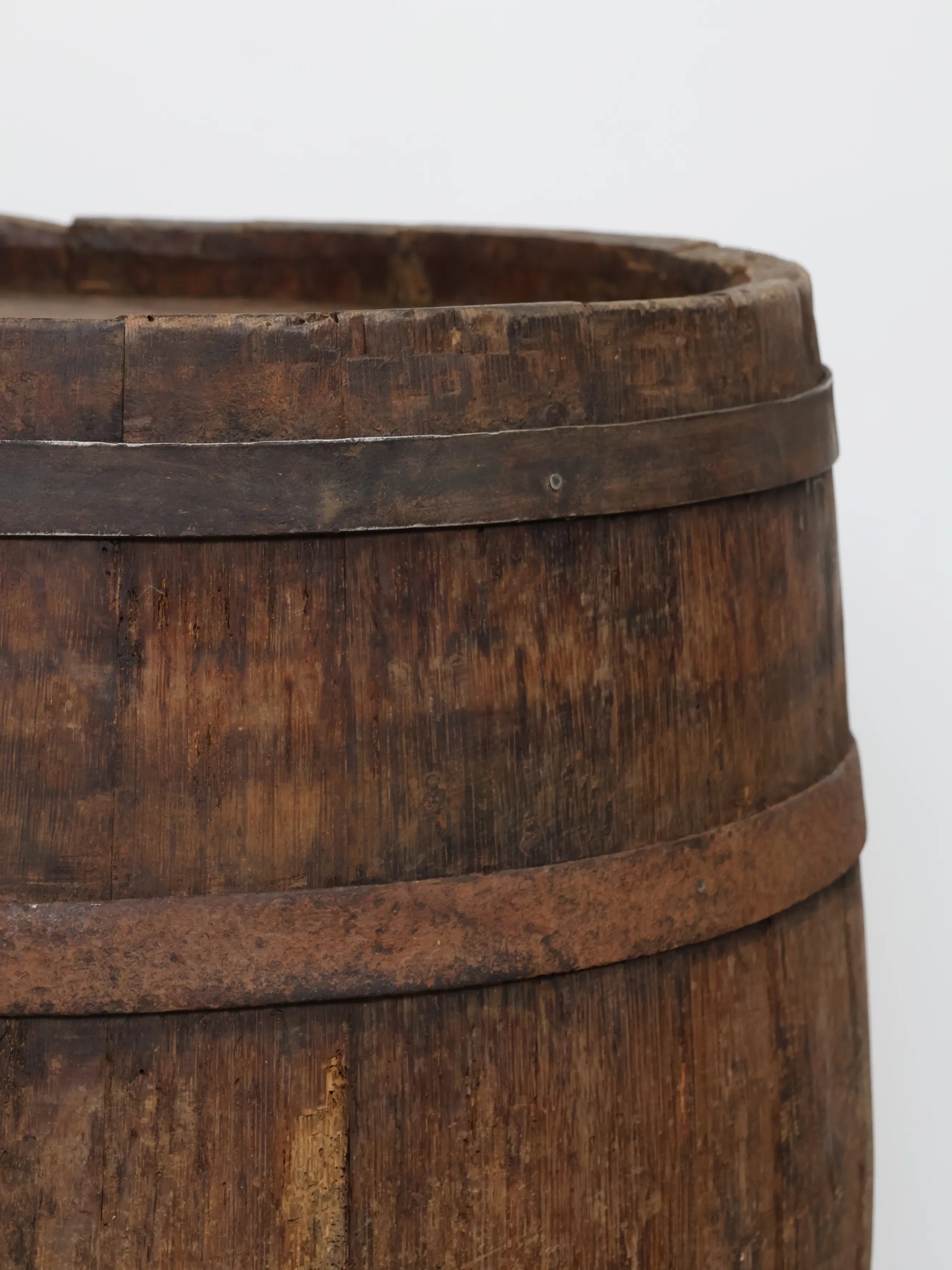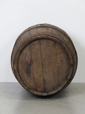 長い年月を経て深みを増した木肌と錆びた鉄帯が、ヴィンテージならではの風格ある表情を生み出しています。