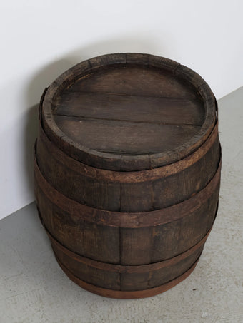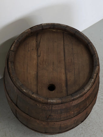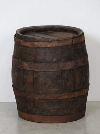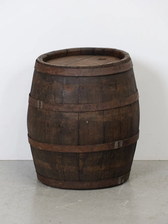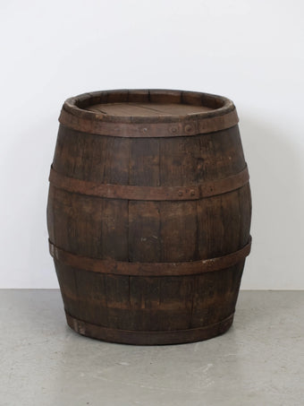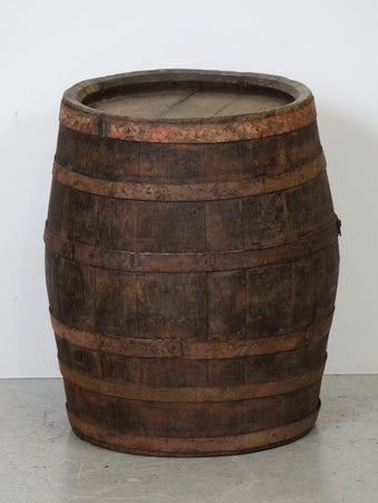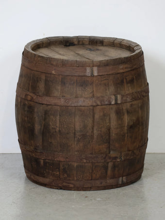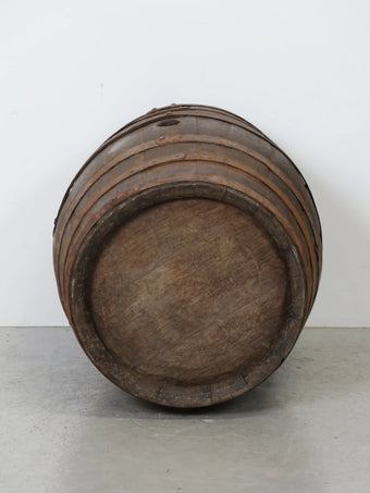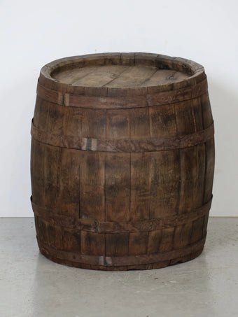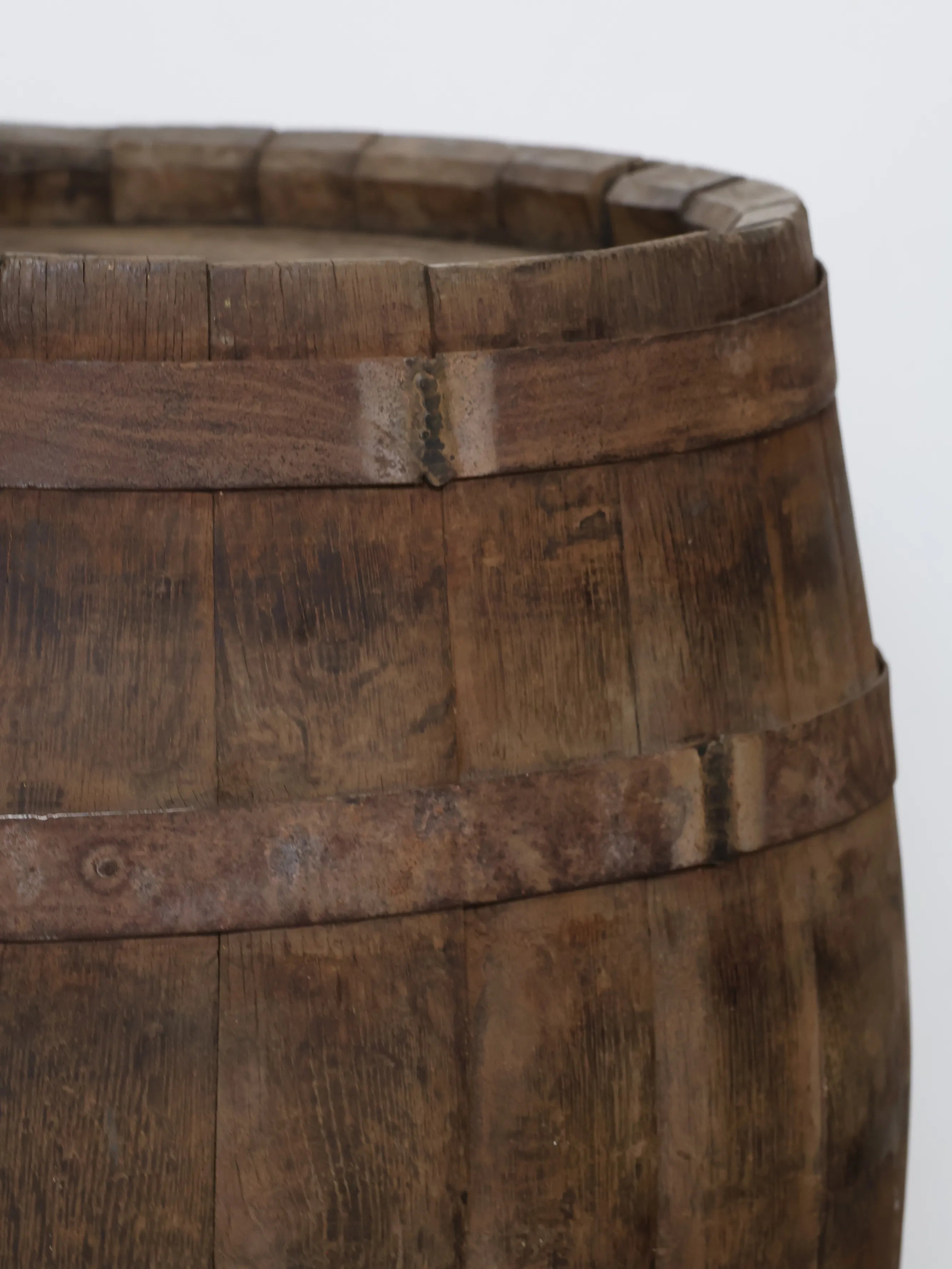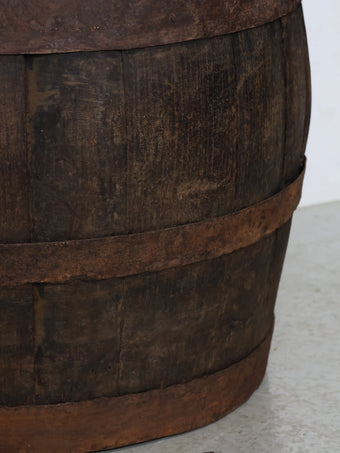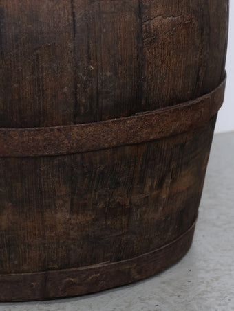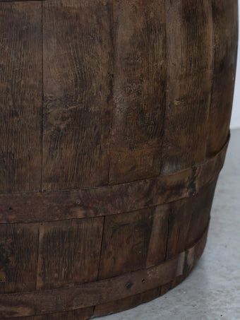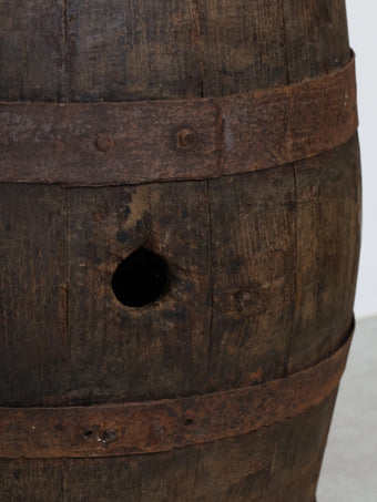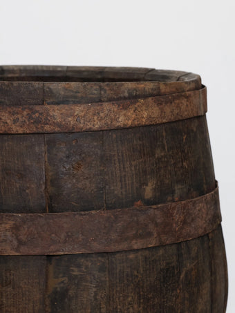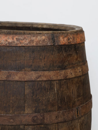厚みのある木板を組み合わせ、鉄製のフープでしっかりと固定された伝統的な樽の構造が特徴。