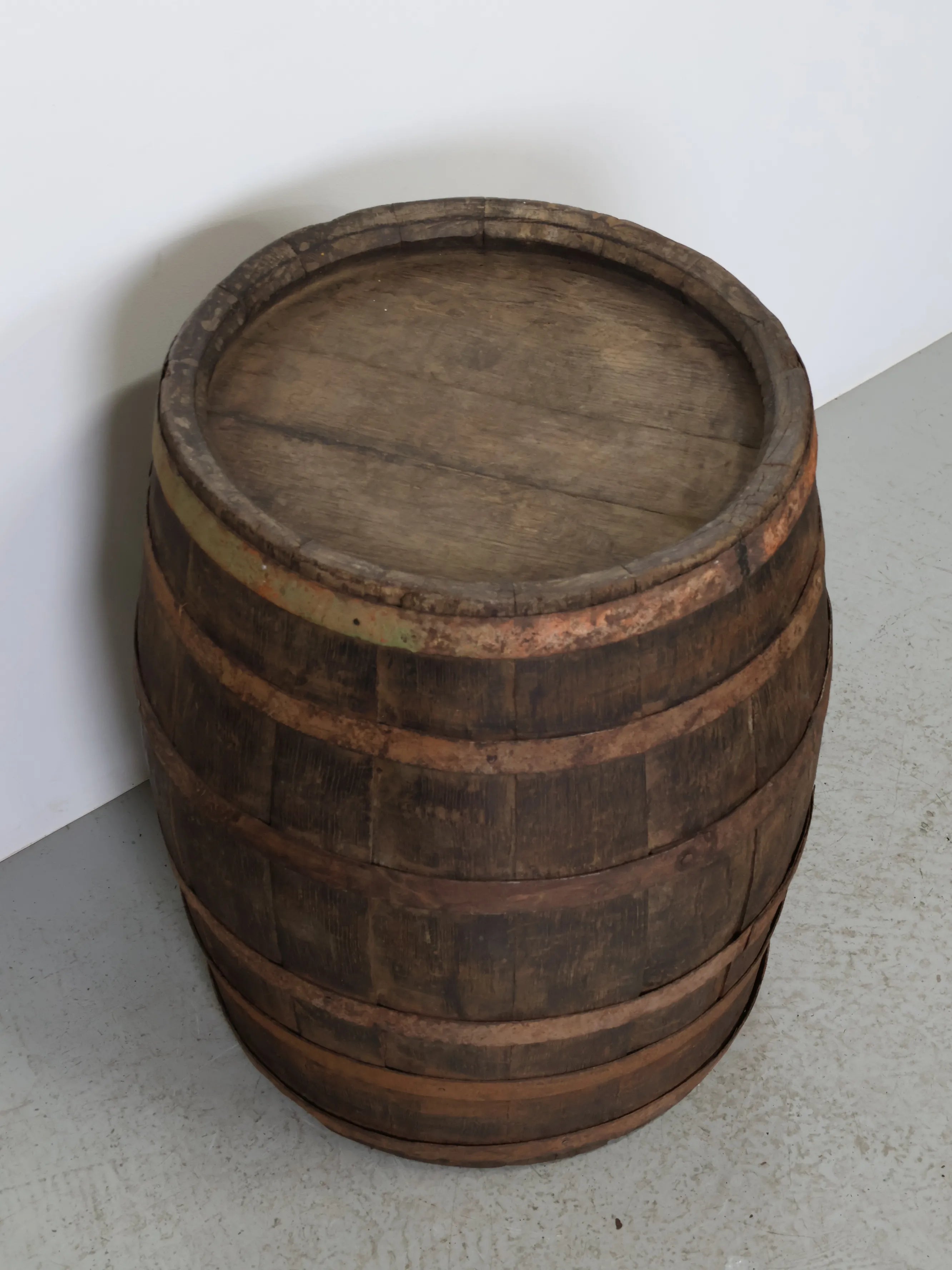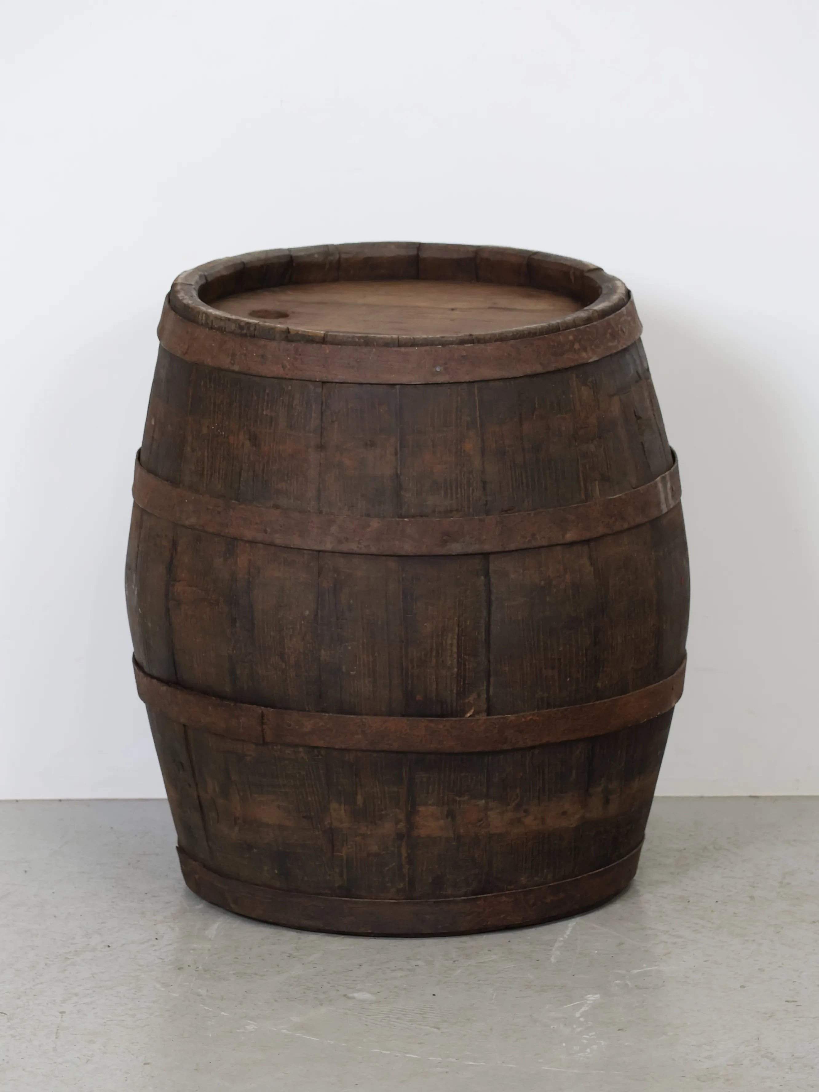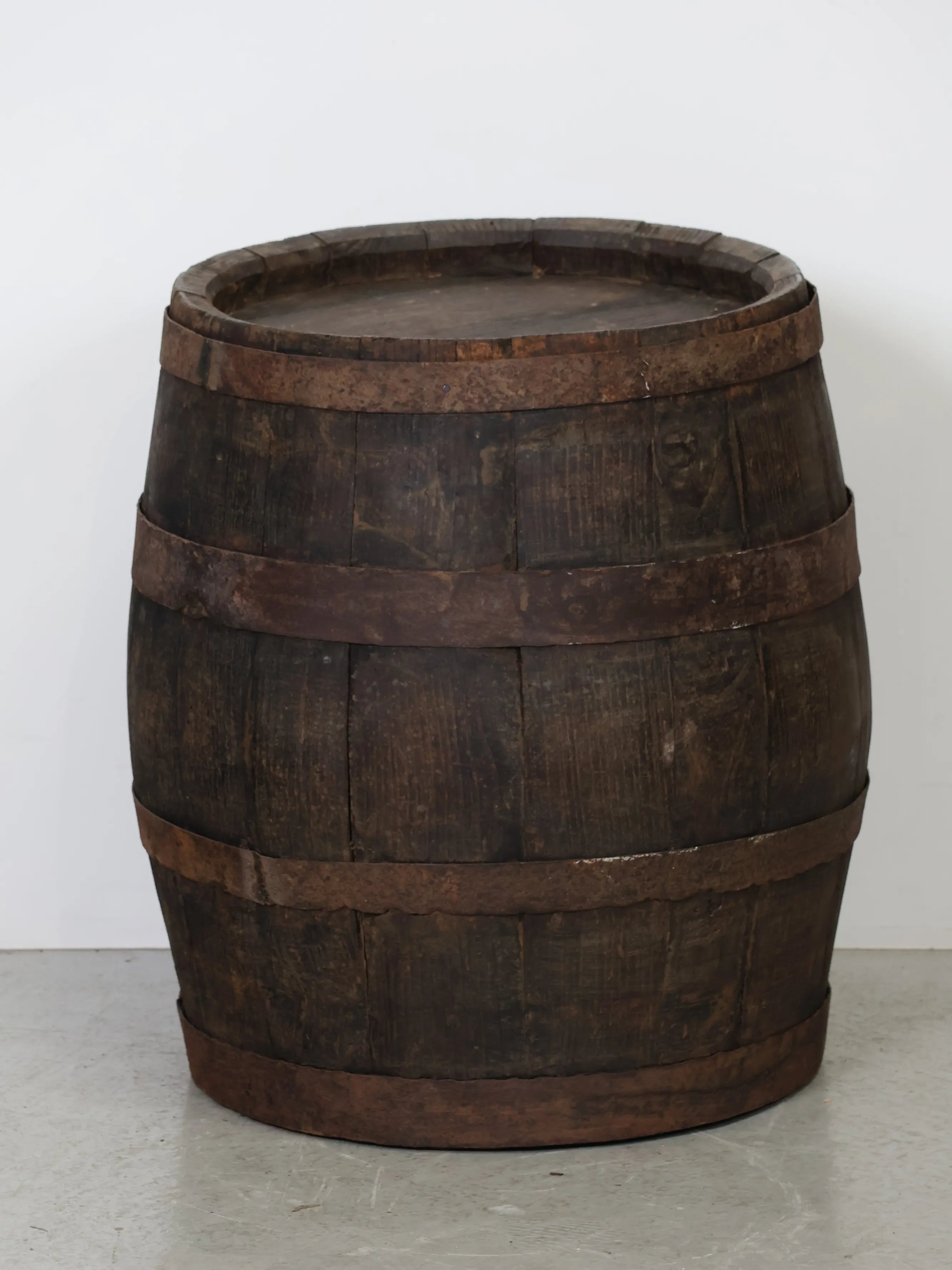 厚みのある木板を組み合わせ、鉄製のフープでしっかりと固定された伝統的な樽の構造が特徴。