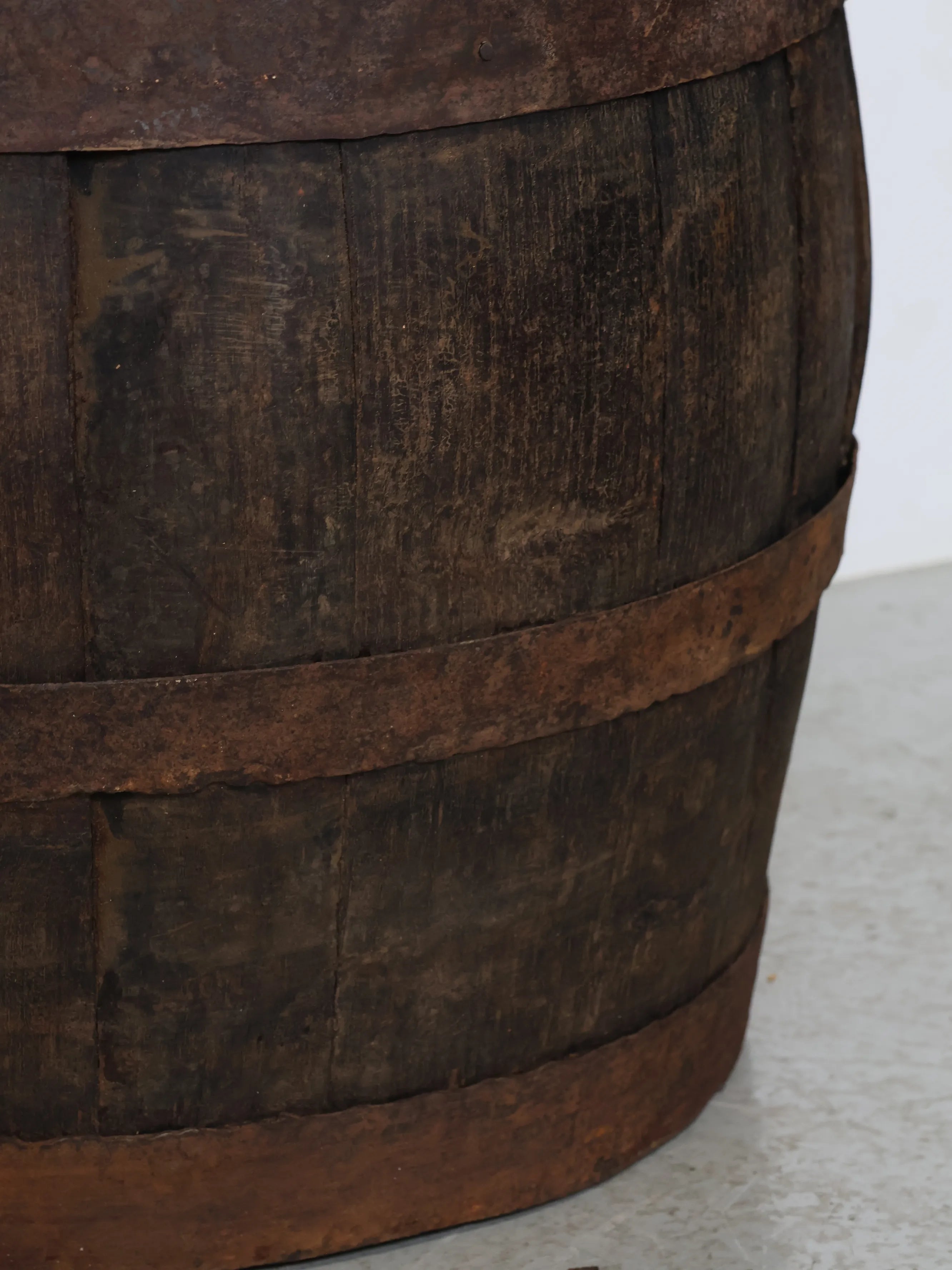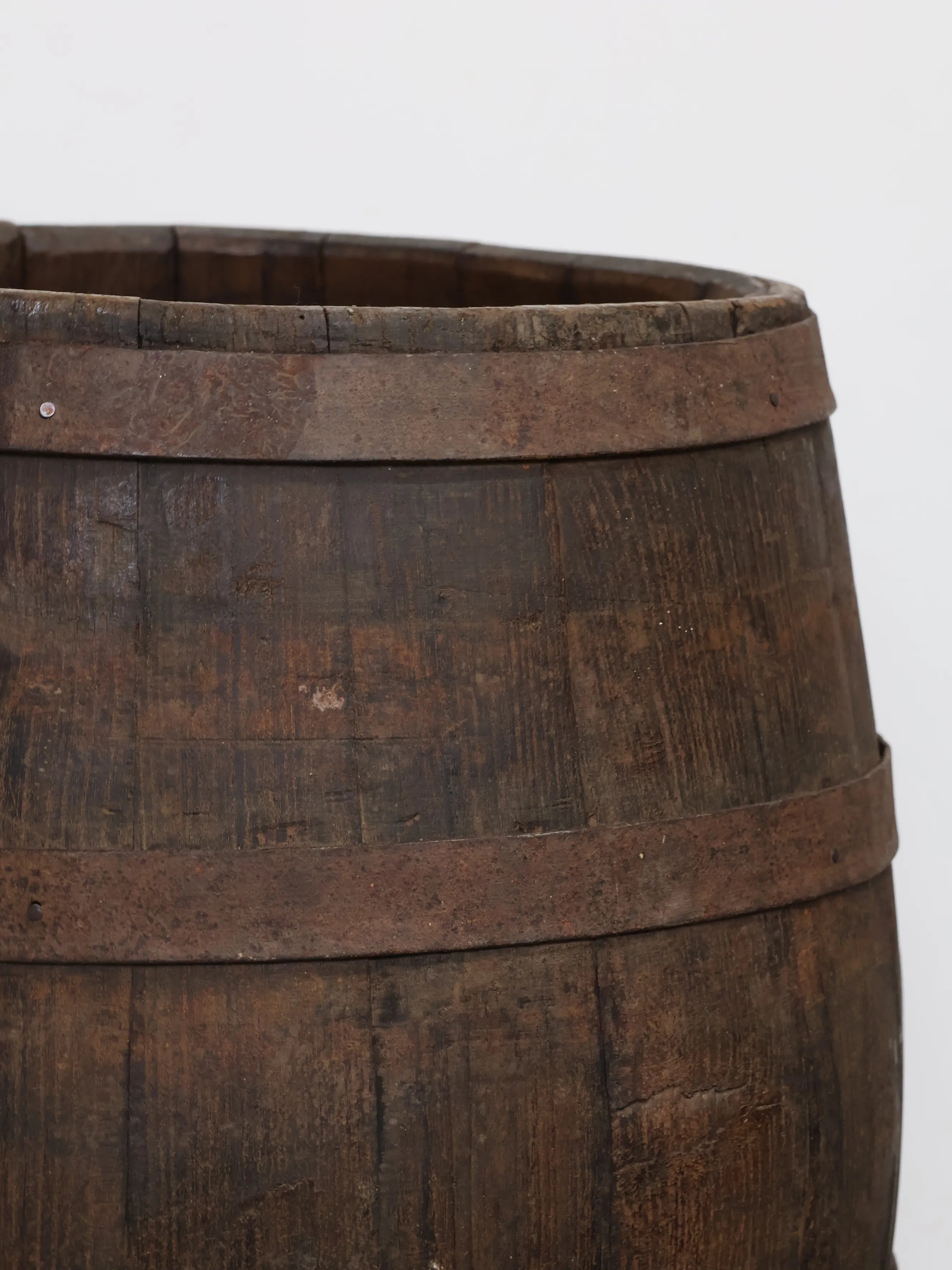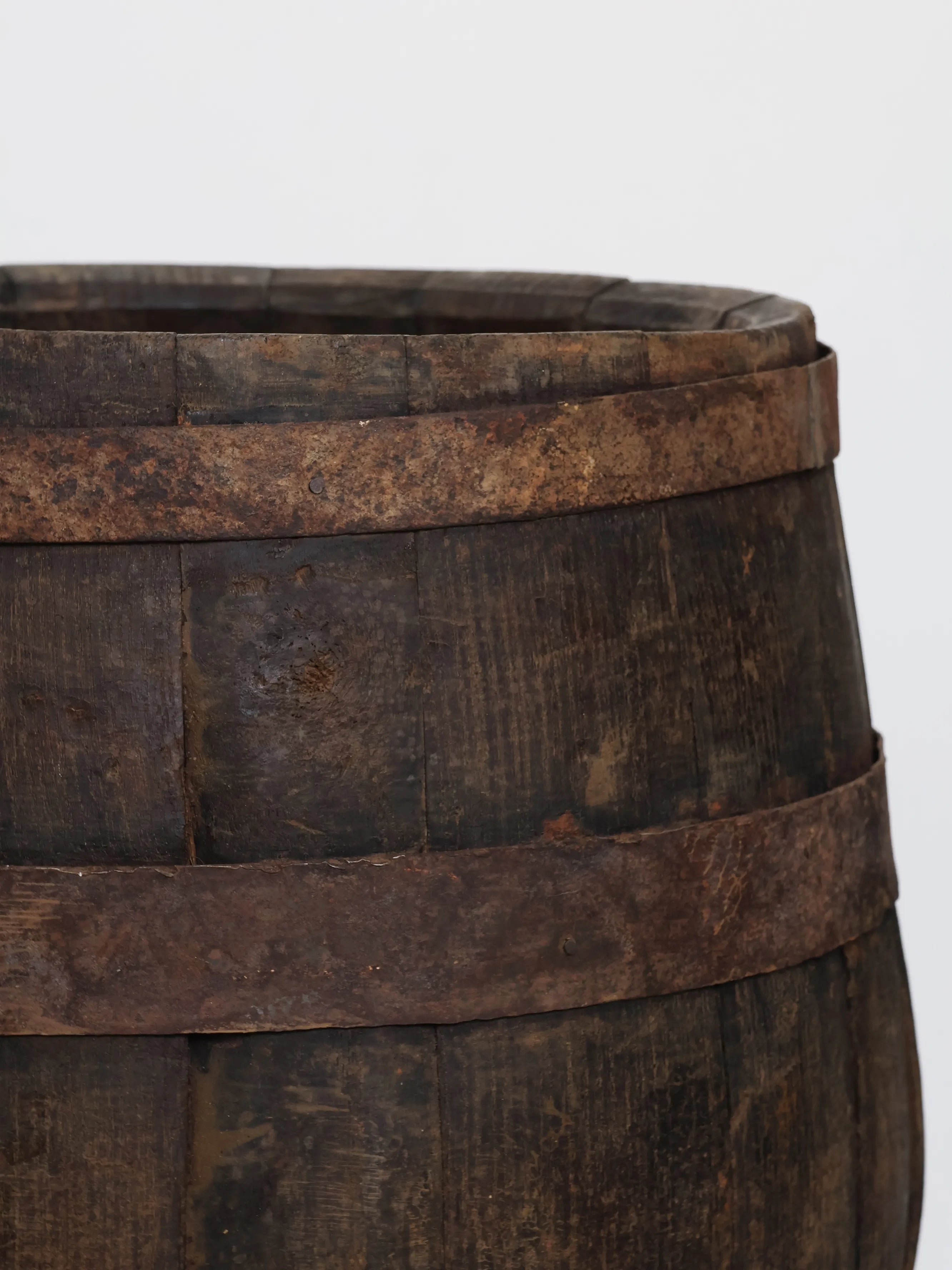 長い年月を経て深みを増した木肌と錆びた鉄帯が、ヴィンテージならではの風格ある表情を生み出しています。