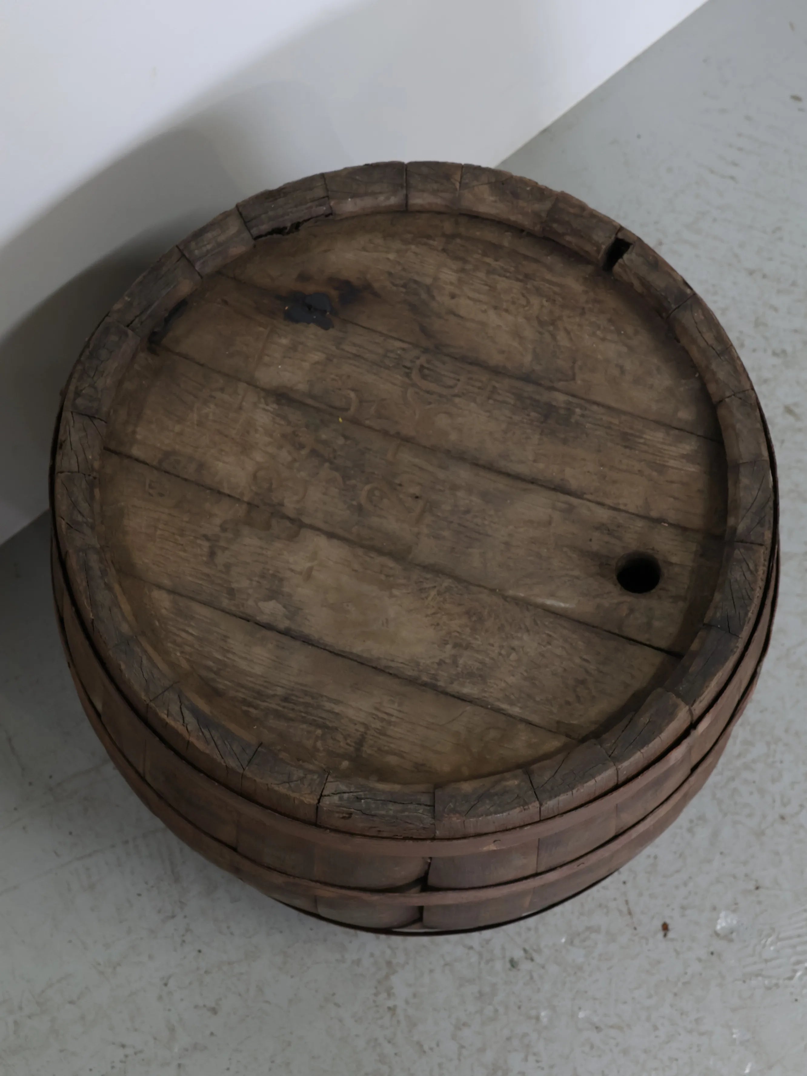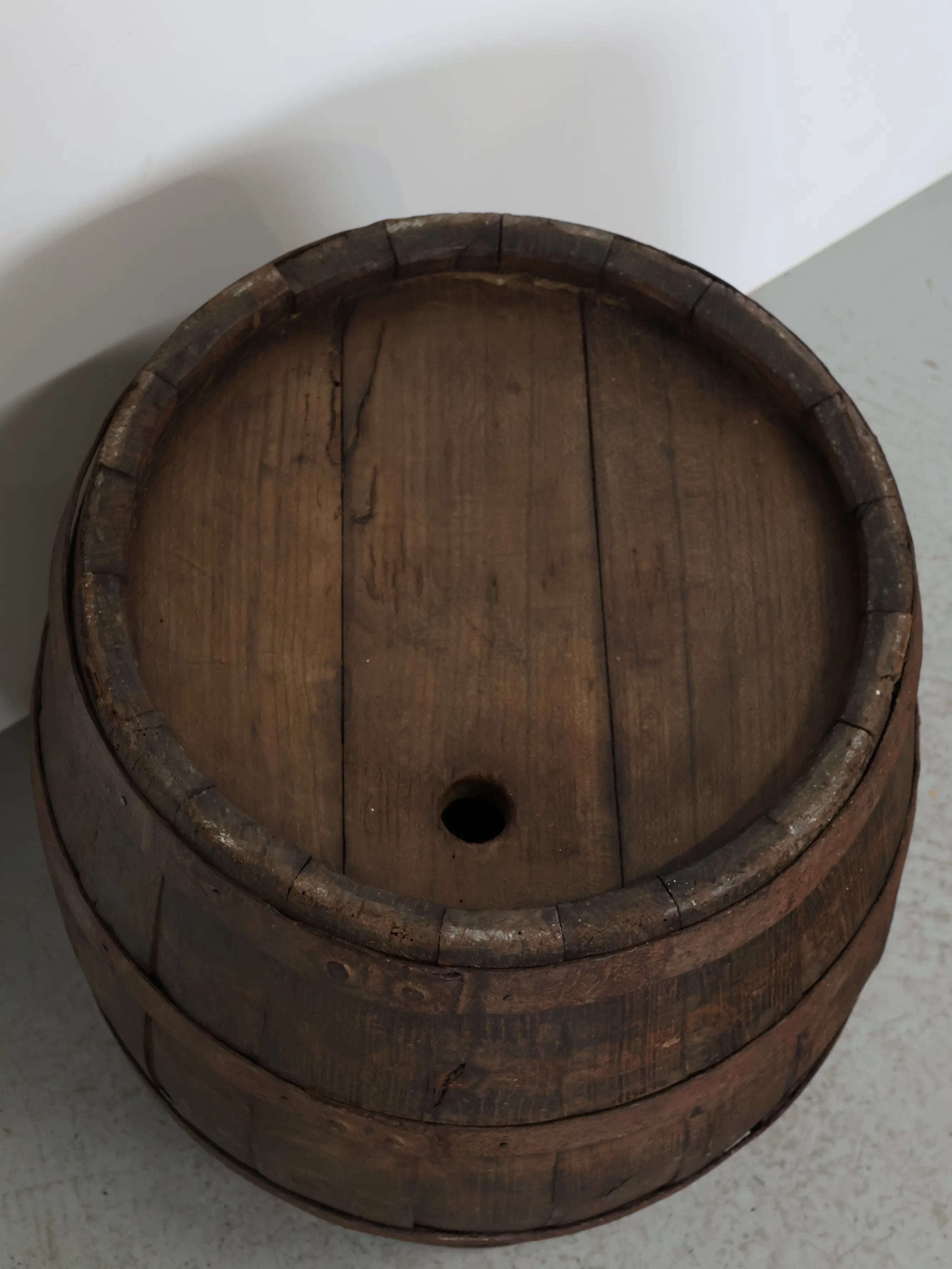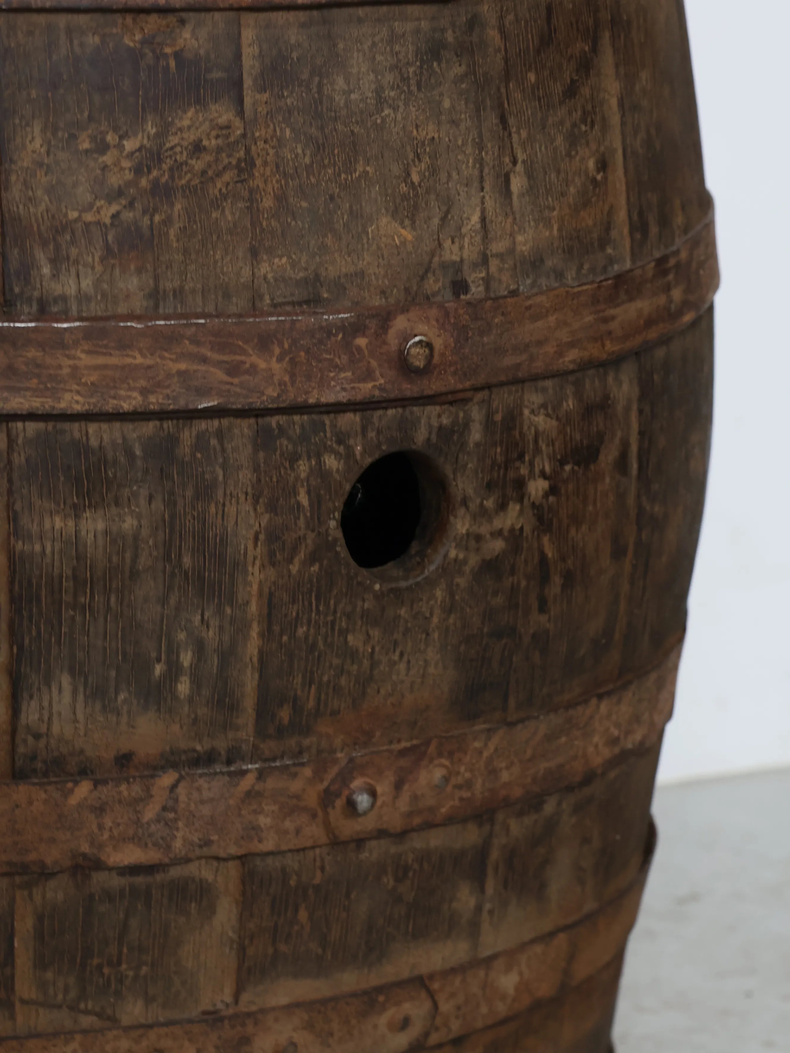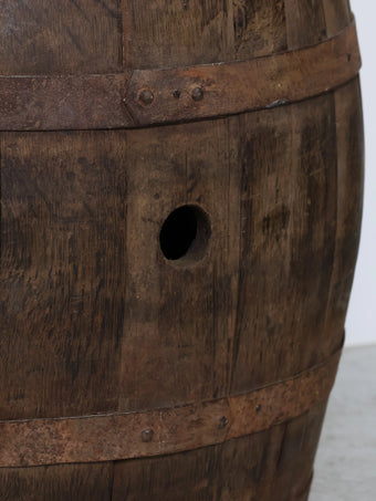 側面には樽特有のバングホール(栓穴)が残っており、実際に使用されていた痕跡を感じられるディテールも魅力のひとつ。