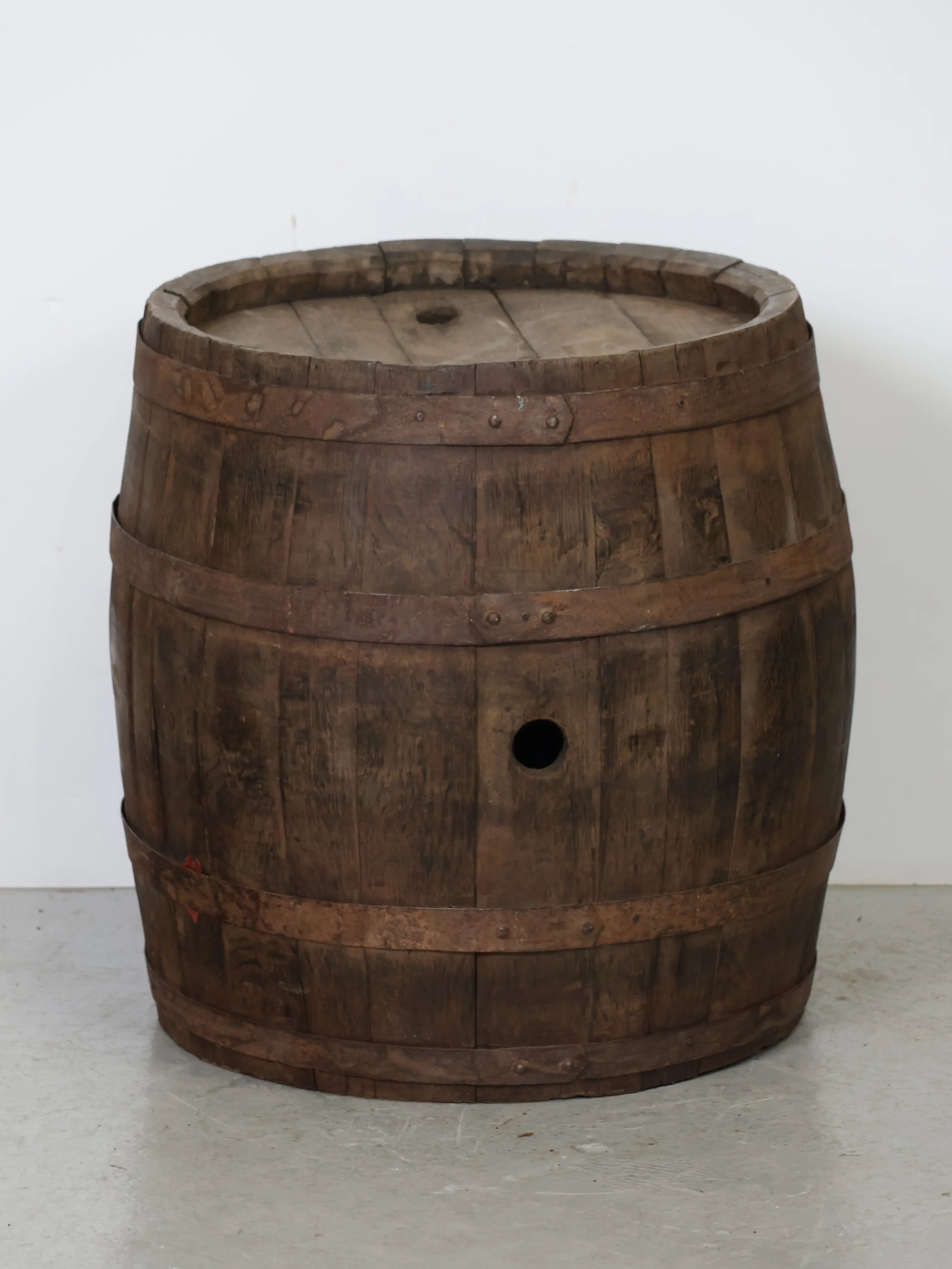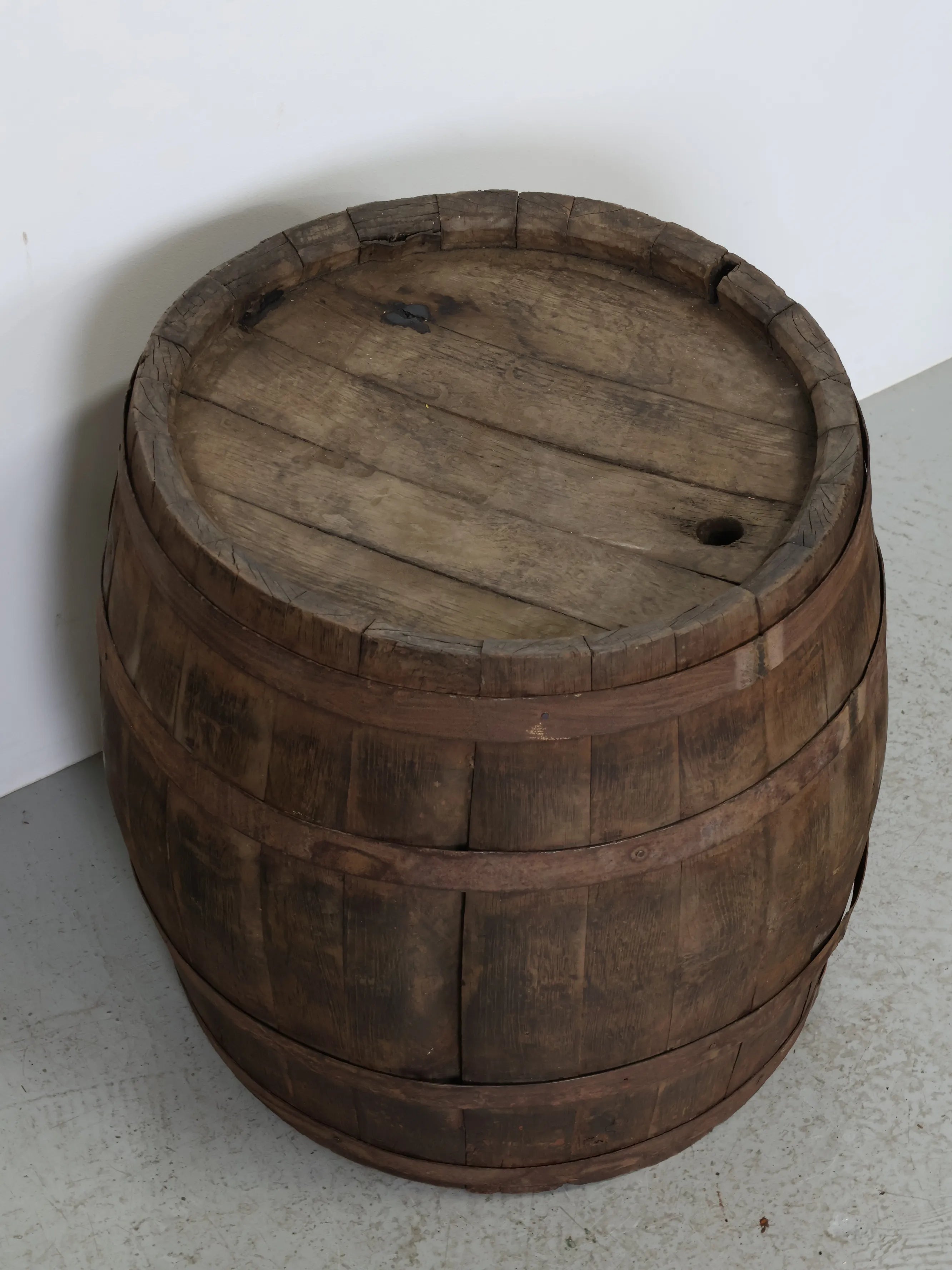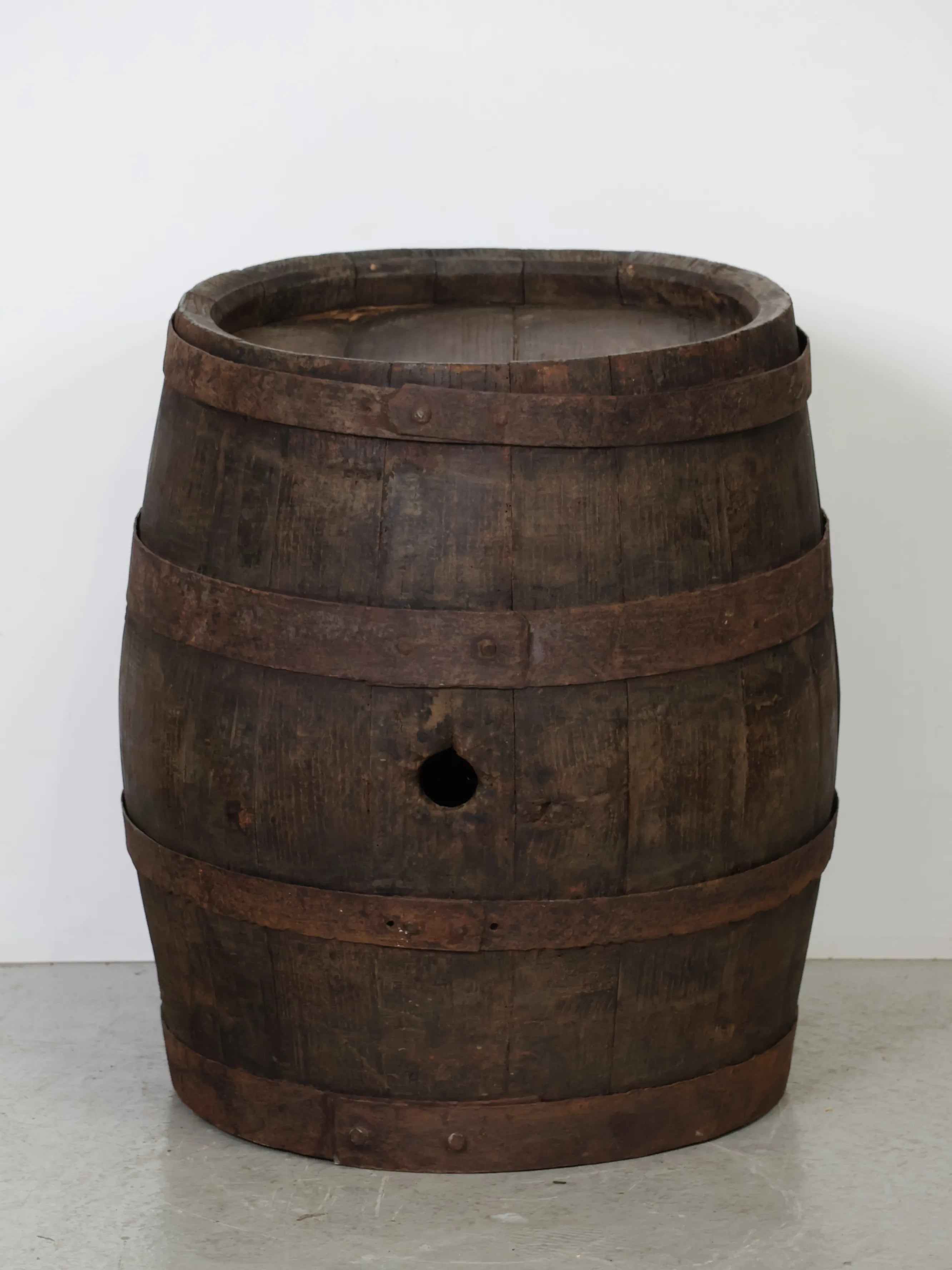 側面には樽特有のバングホール(栓穴)が残っており、実際に使用されていた痕跡を感じられるディテールも魅力のひとつ。