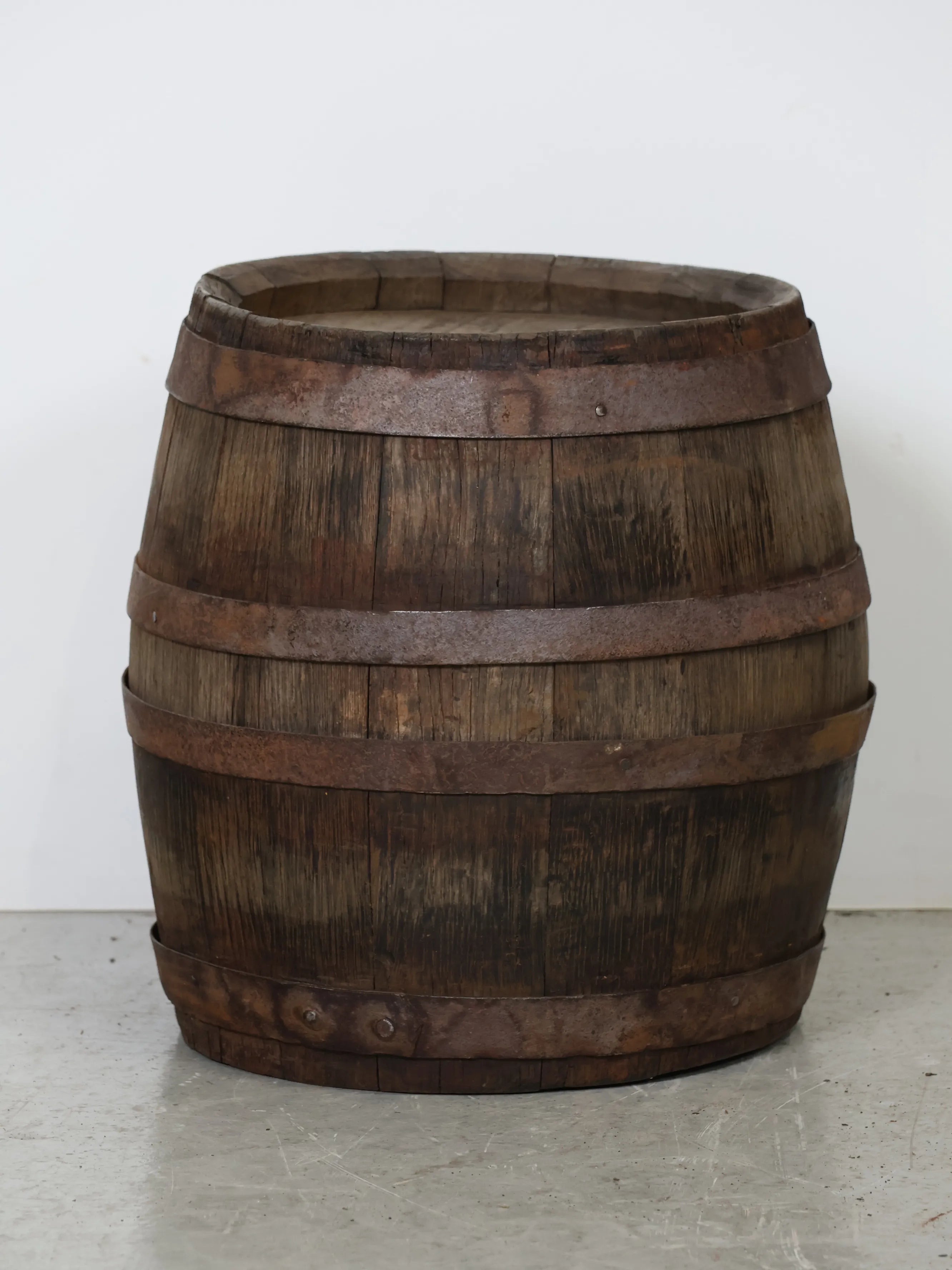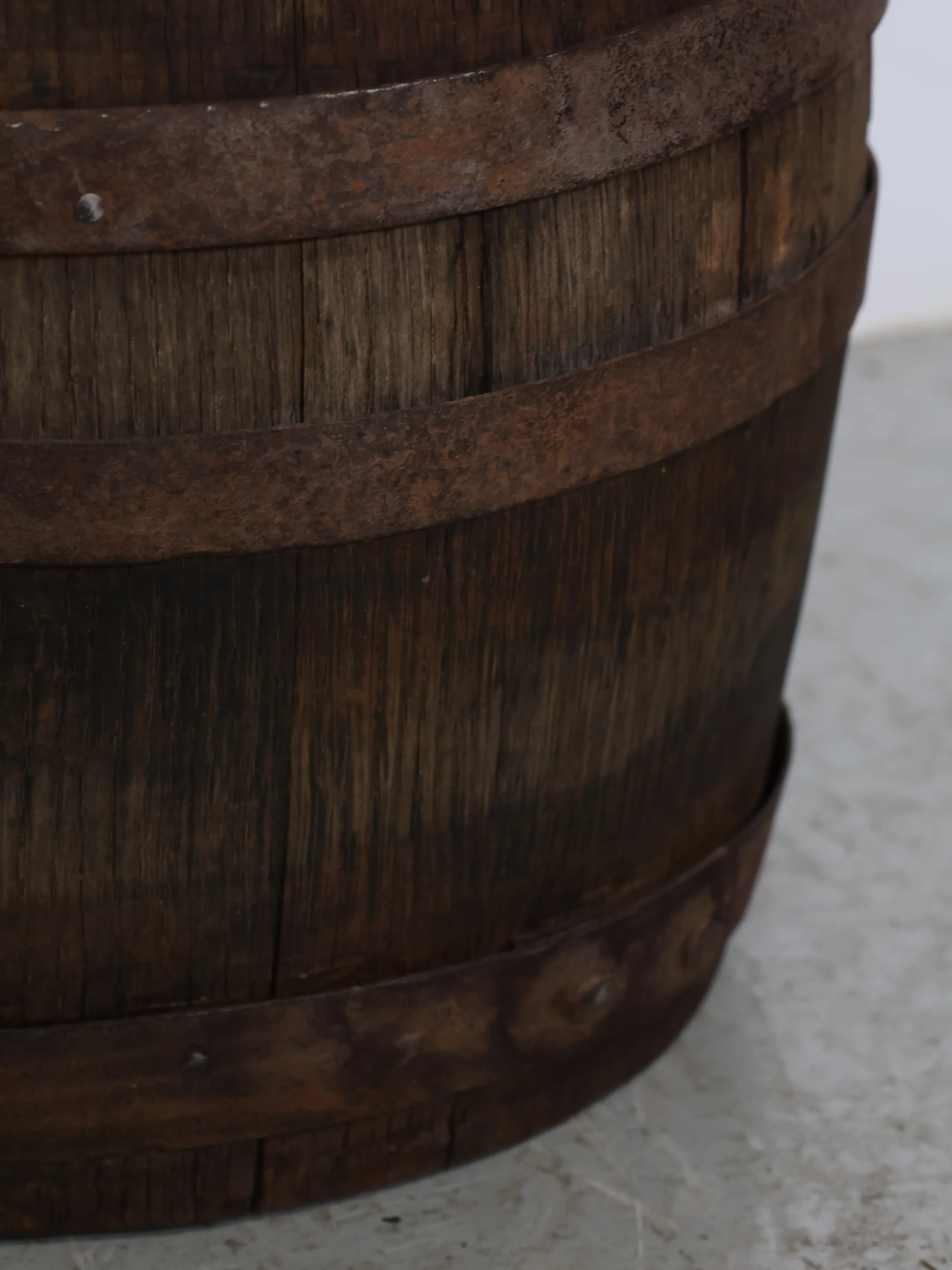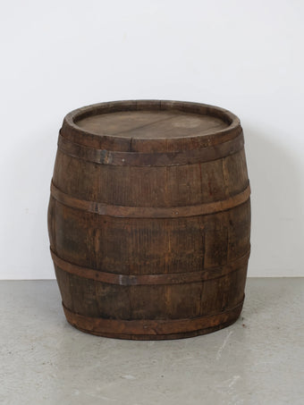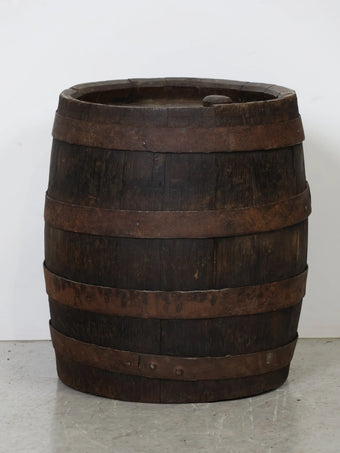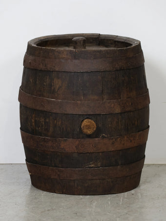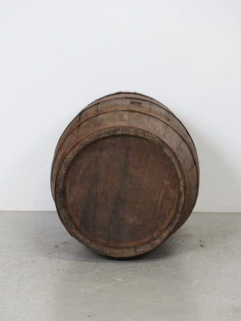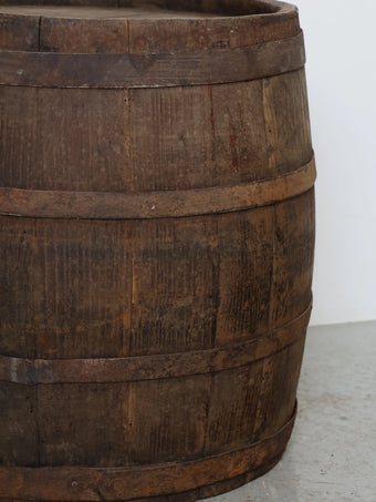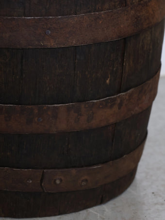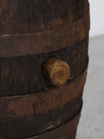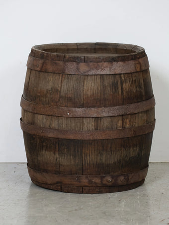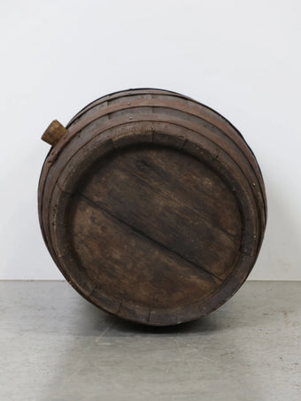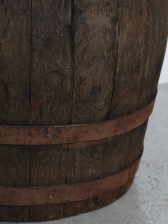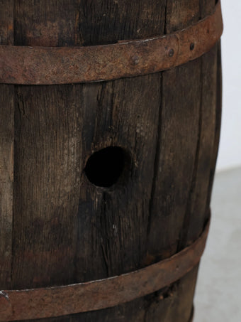 厚みのある木板を組み合わせ、鉄製のフープでしっかりと固定された伝統的な樽の構造が特徴。