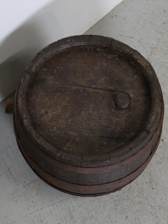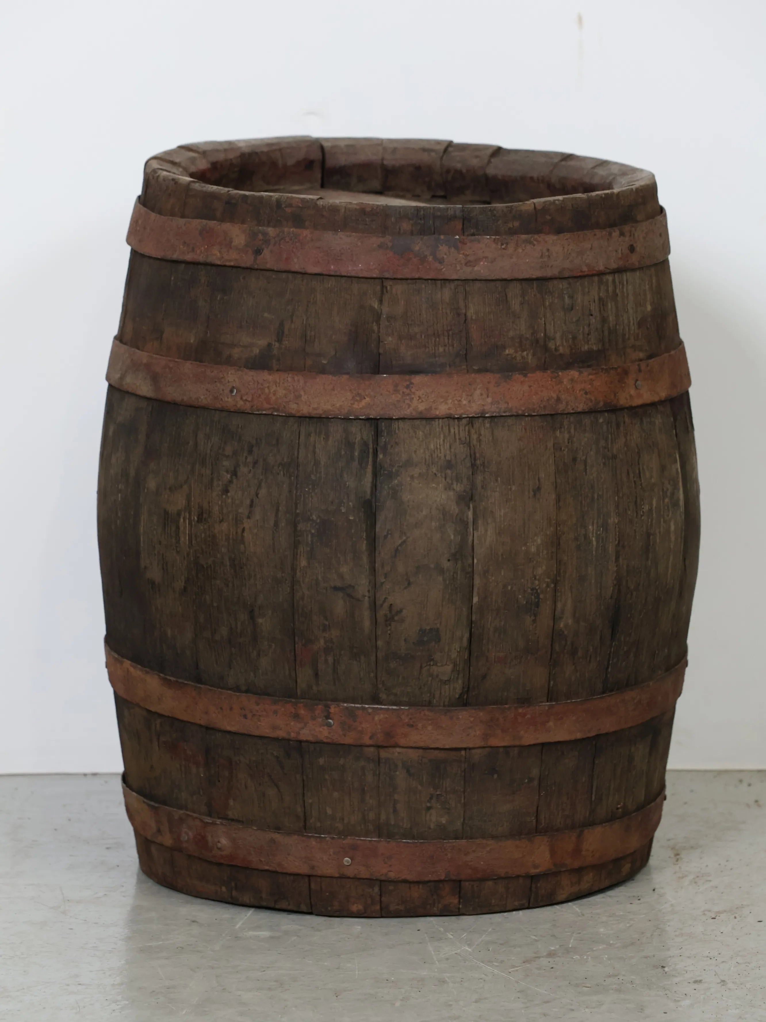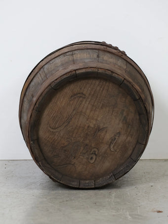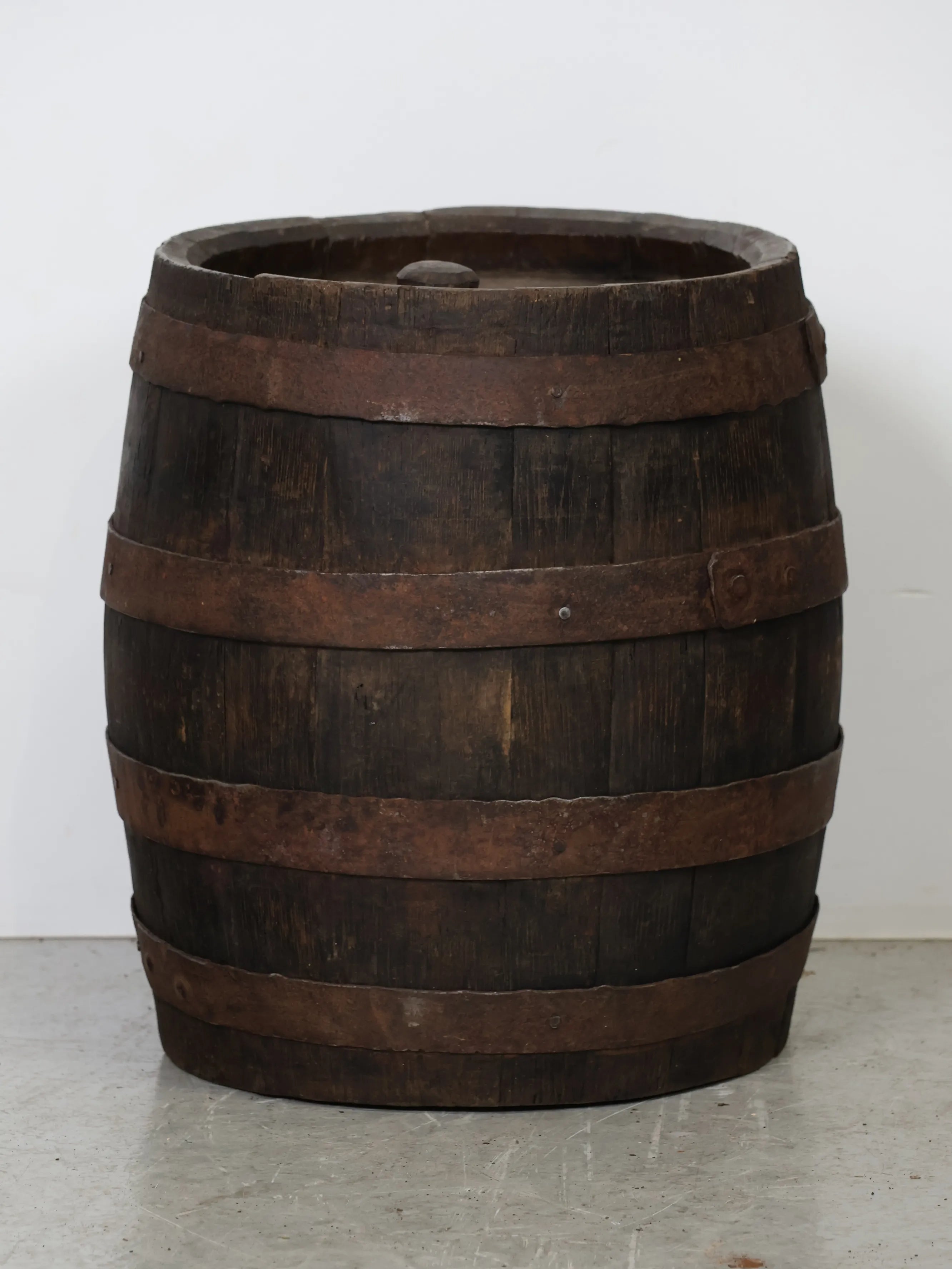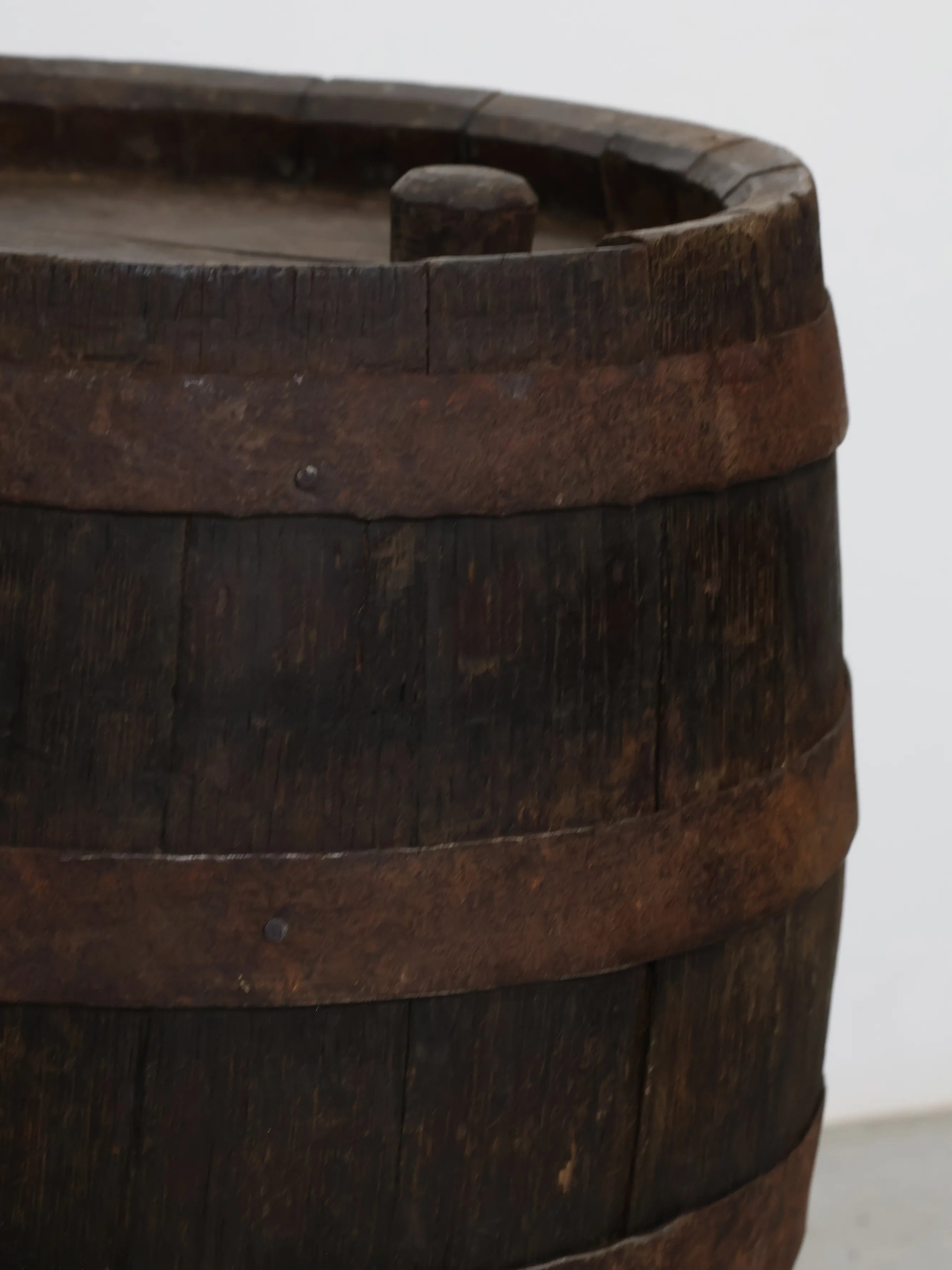 厚みのある木板を組み合わせ、鉄製のフープでしっかりと固定された伝統的な樽の構造が特徴。