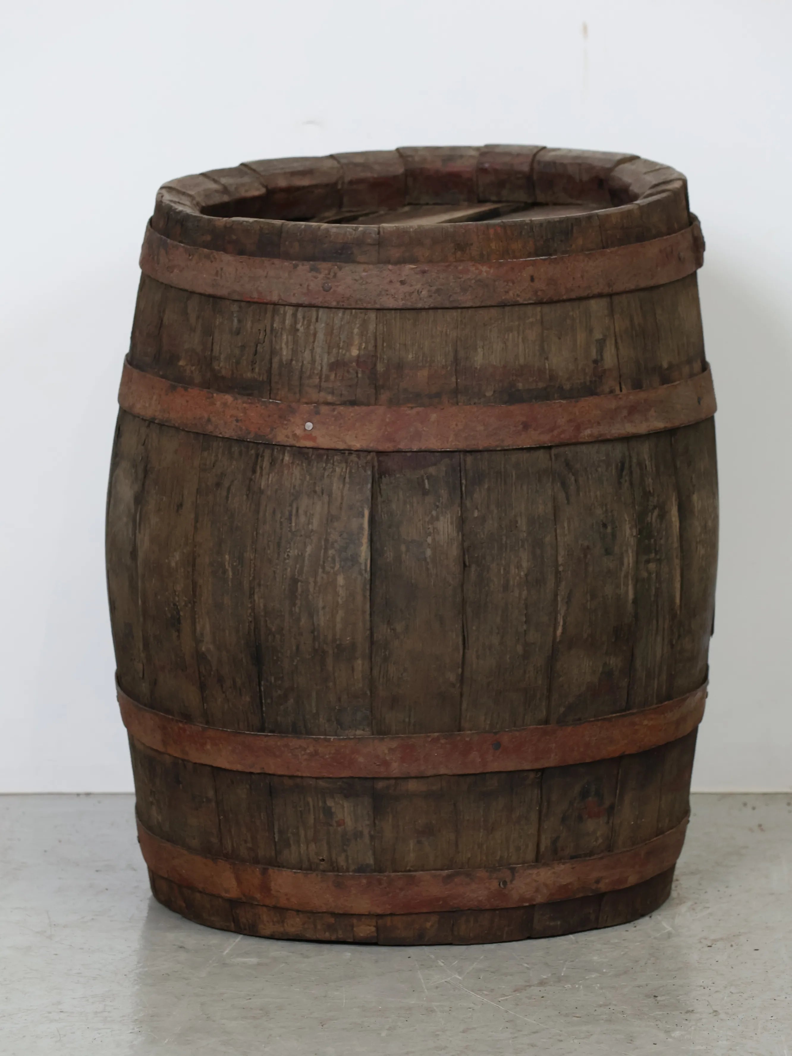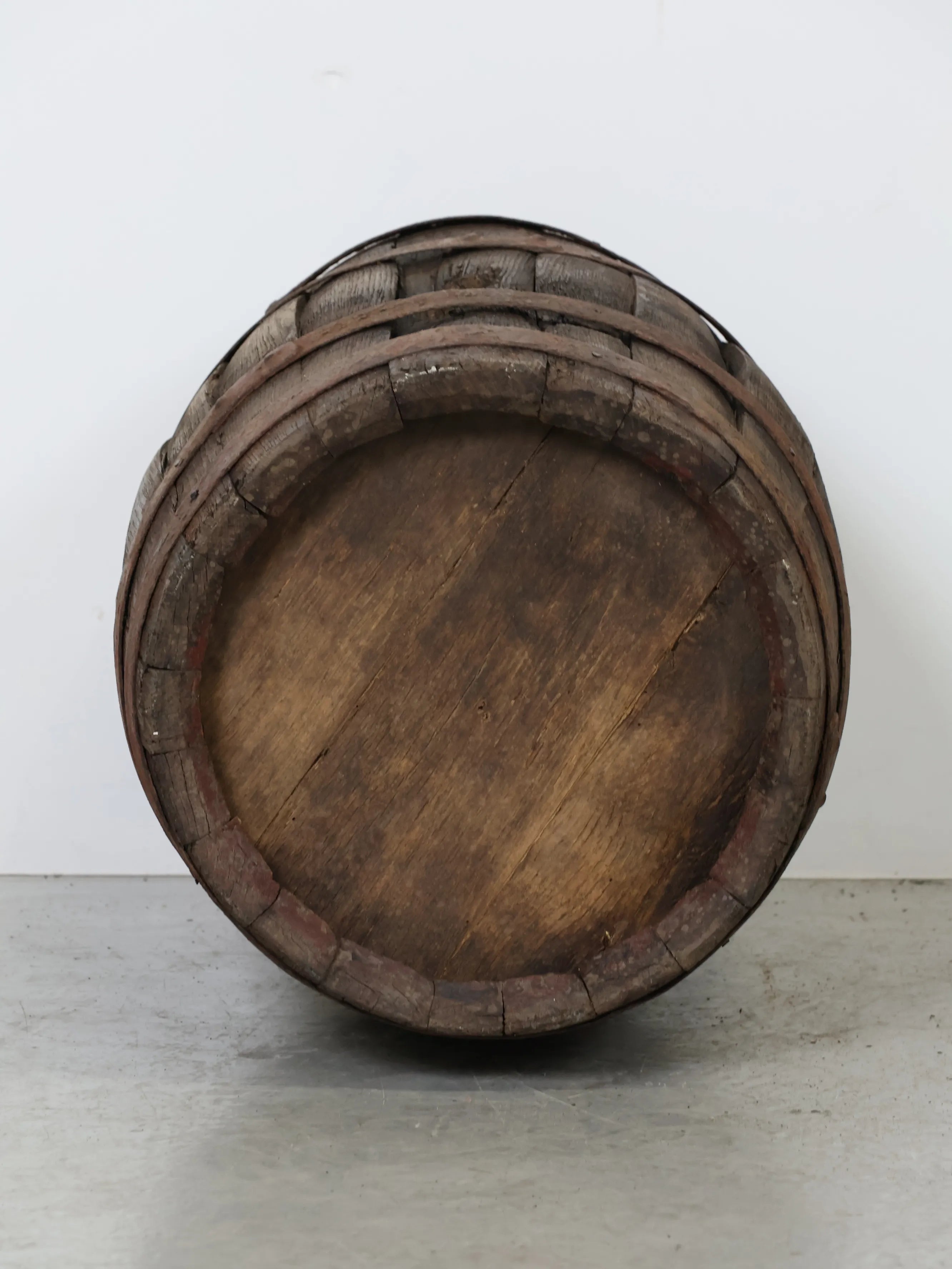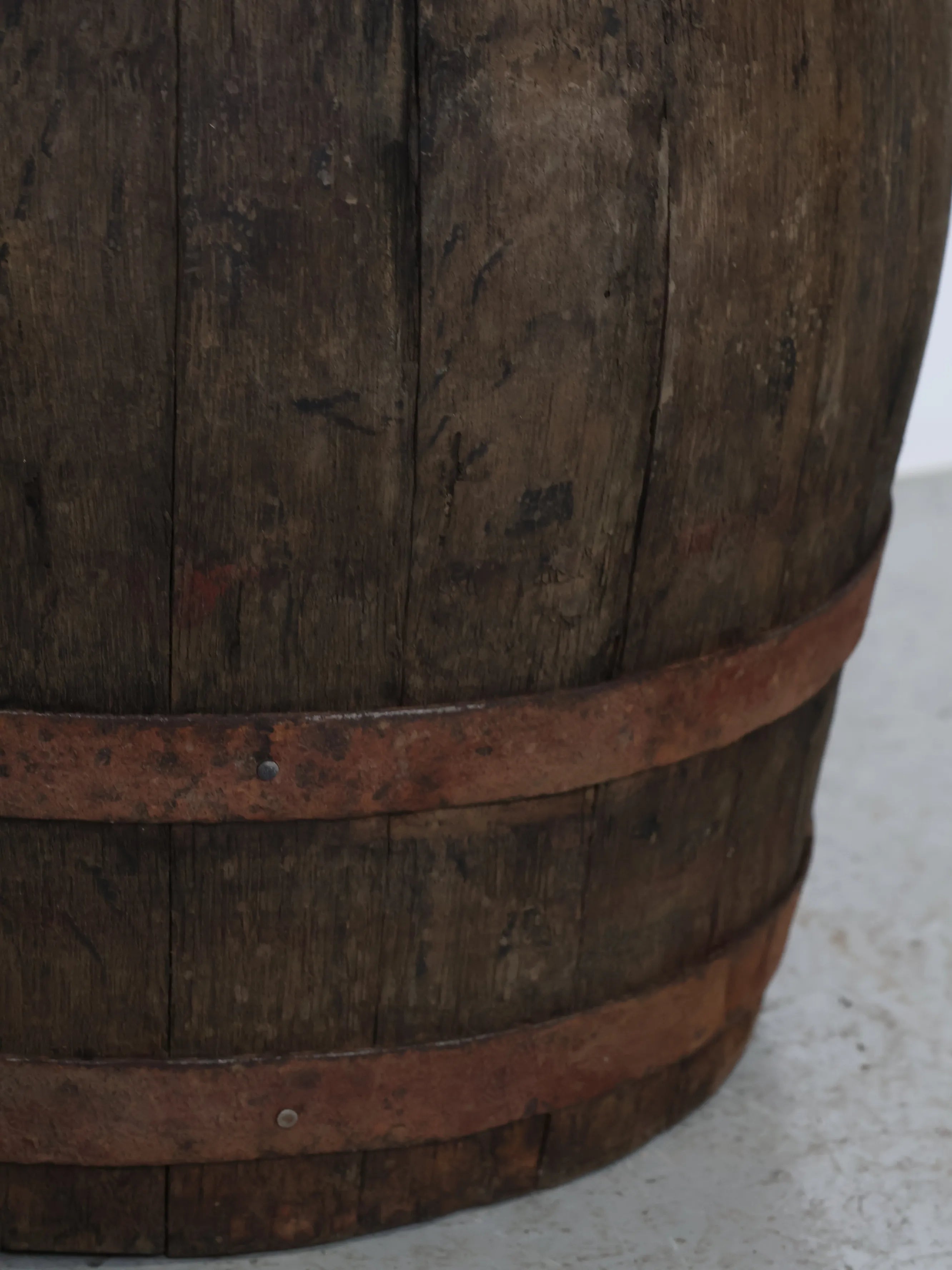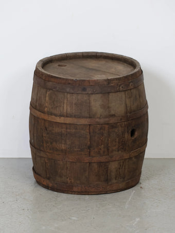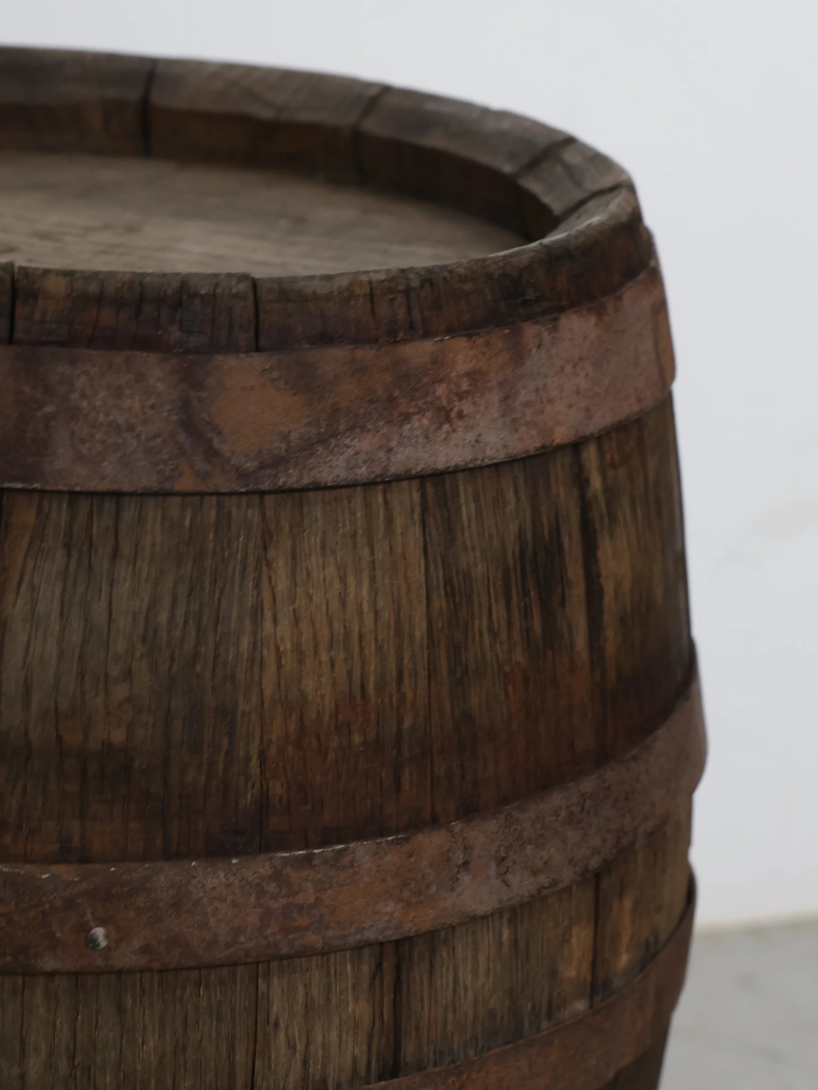 長い年月を経て深みを増した木肌と錆びた鉄帯が、ヴィンテージならではの風格ある表情を生み出しています。