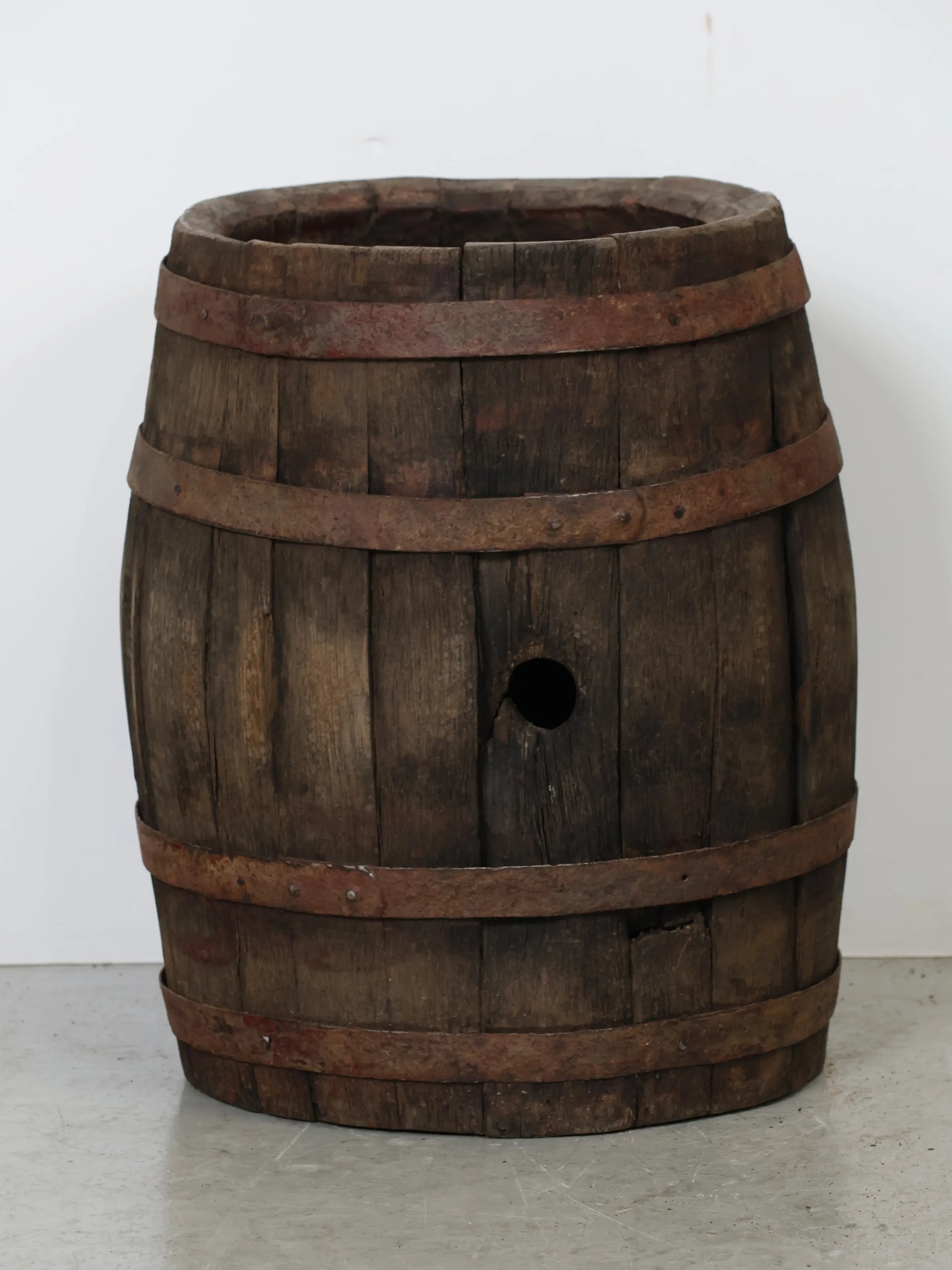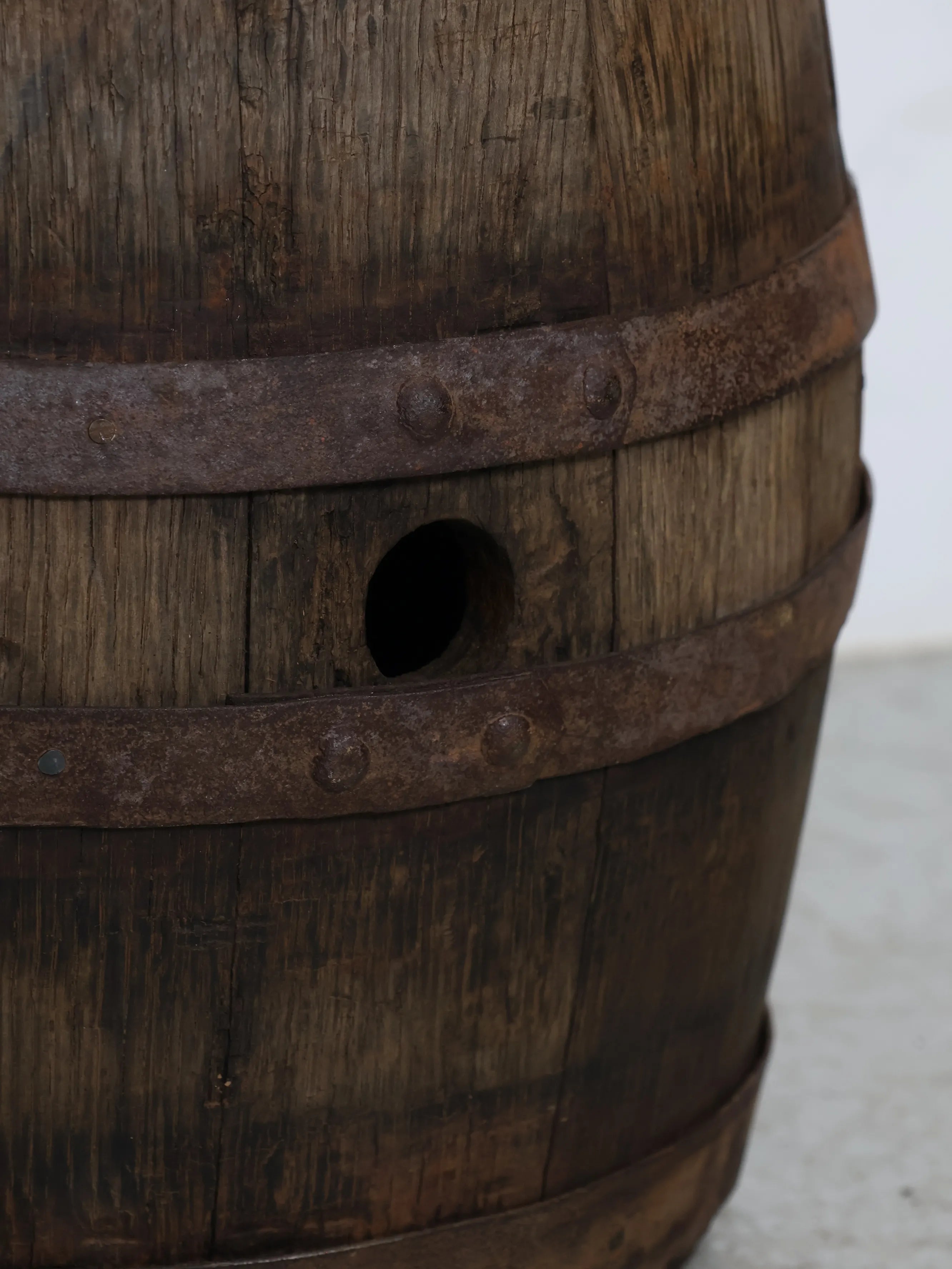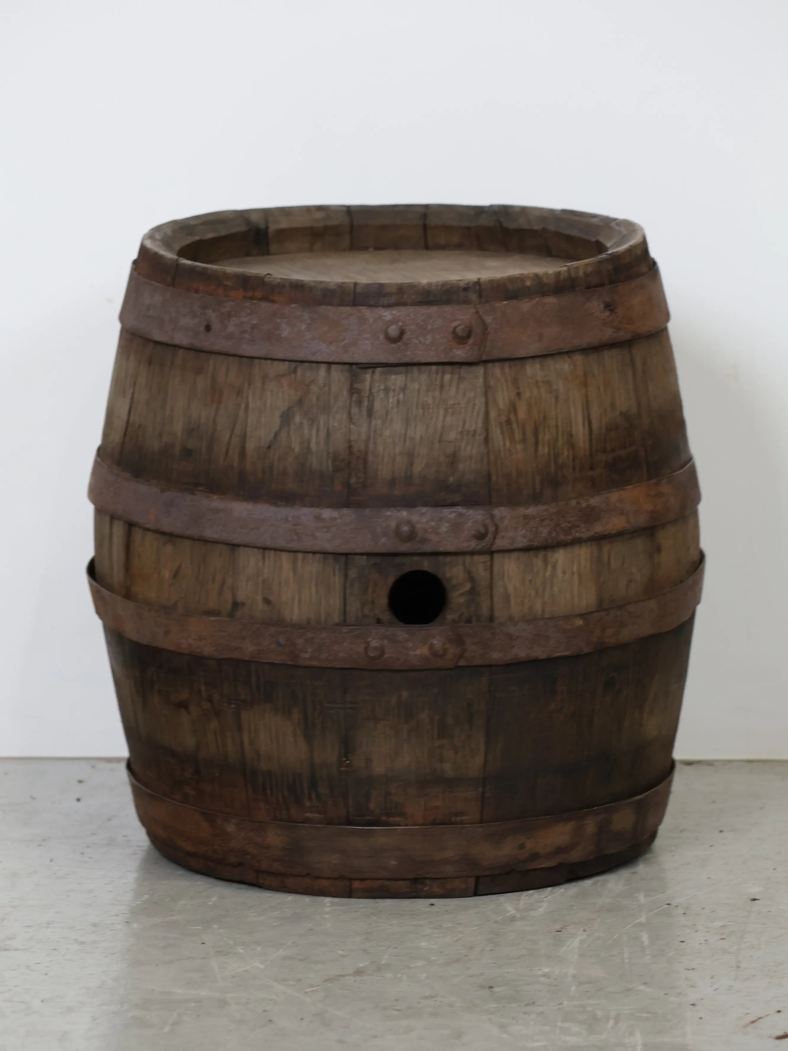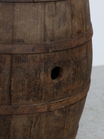 側面には樽特有のバングホール(栓穴)が残っており、実際に使用されていた痕跡を感じられるディテールも魅力のひとつ。