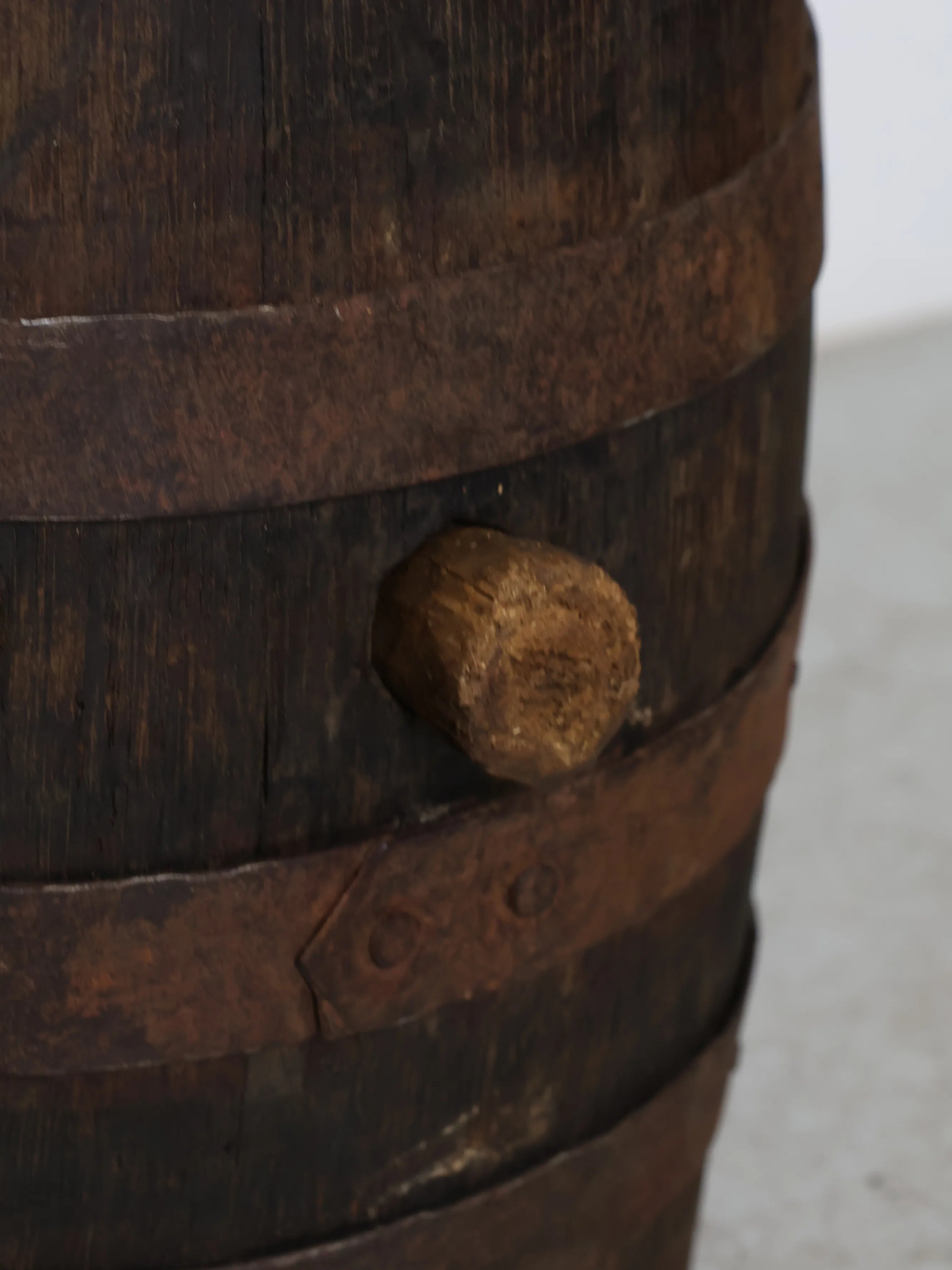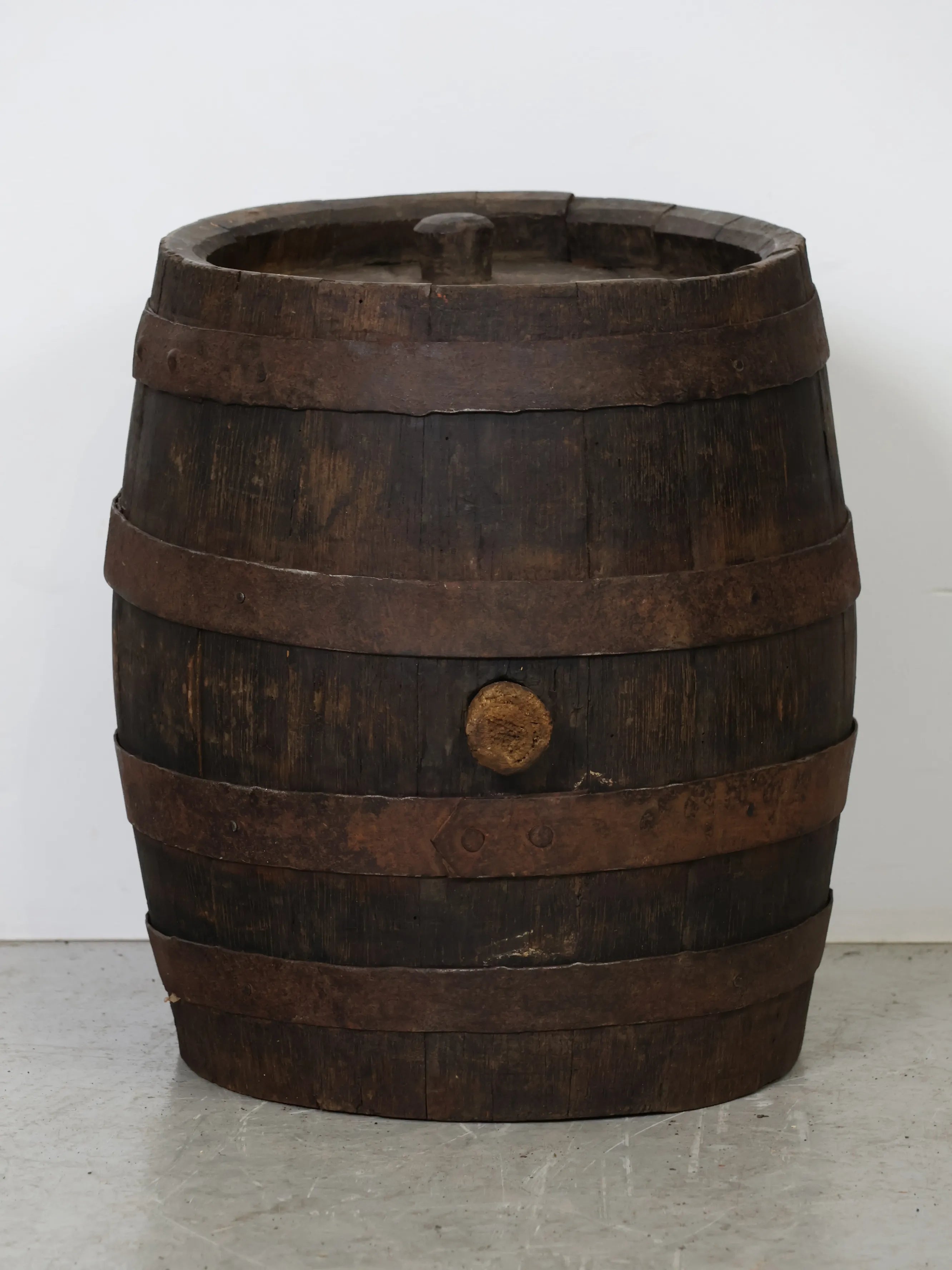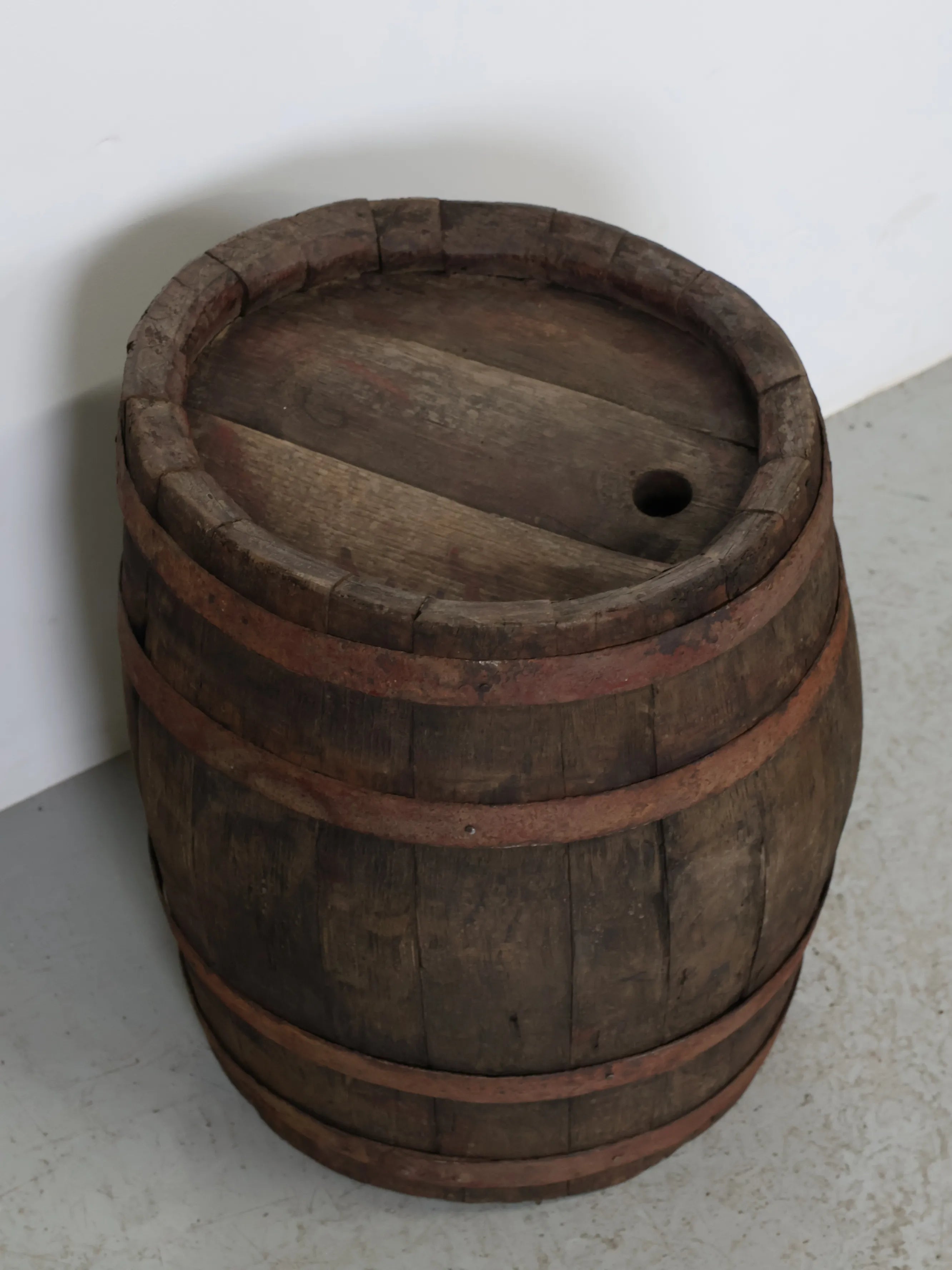 側面には樽特有のバングホール(栓穴)が残っており、実際に使用されていた痕跡を感じられるディテールも魅力のひとつ。