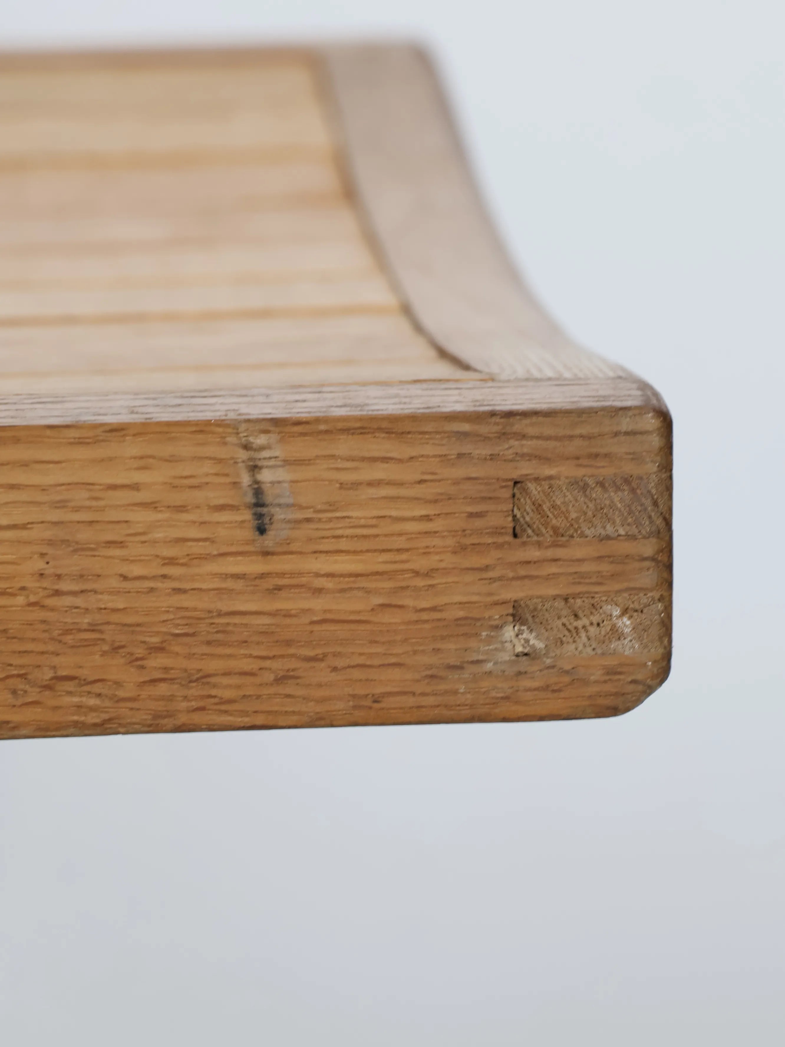 無垢材を使用した温かみのある質感と、直線的でミニマルなデザインが魅力の一脚。座面の接合部には木組みが施されており、シンプルながらもしっかりとした造りが感じられます。